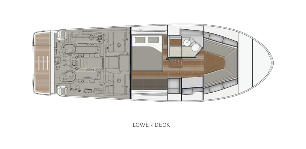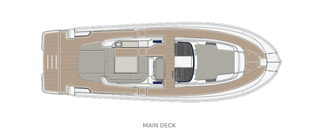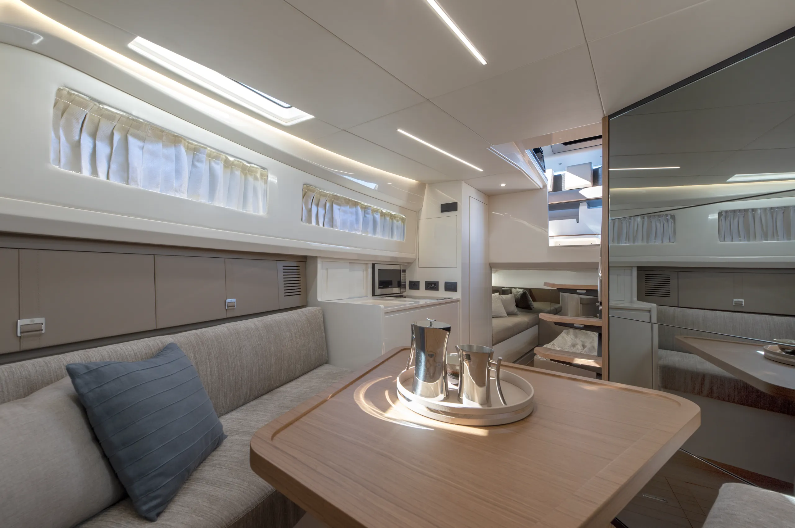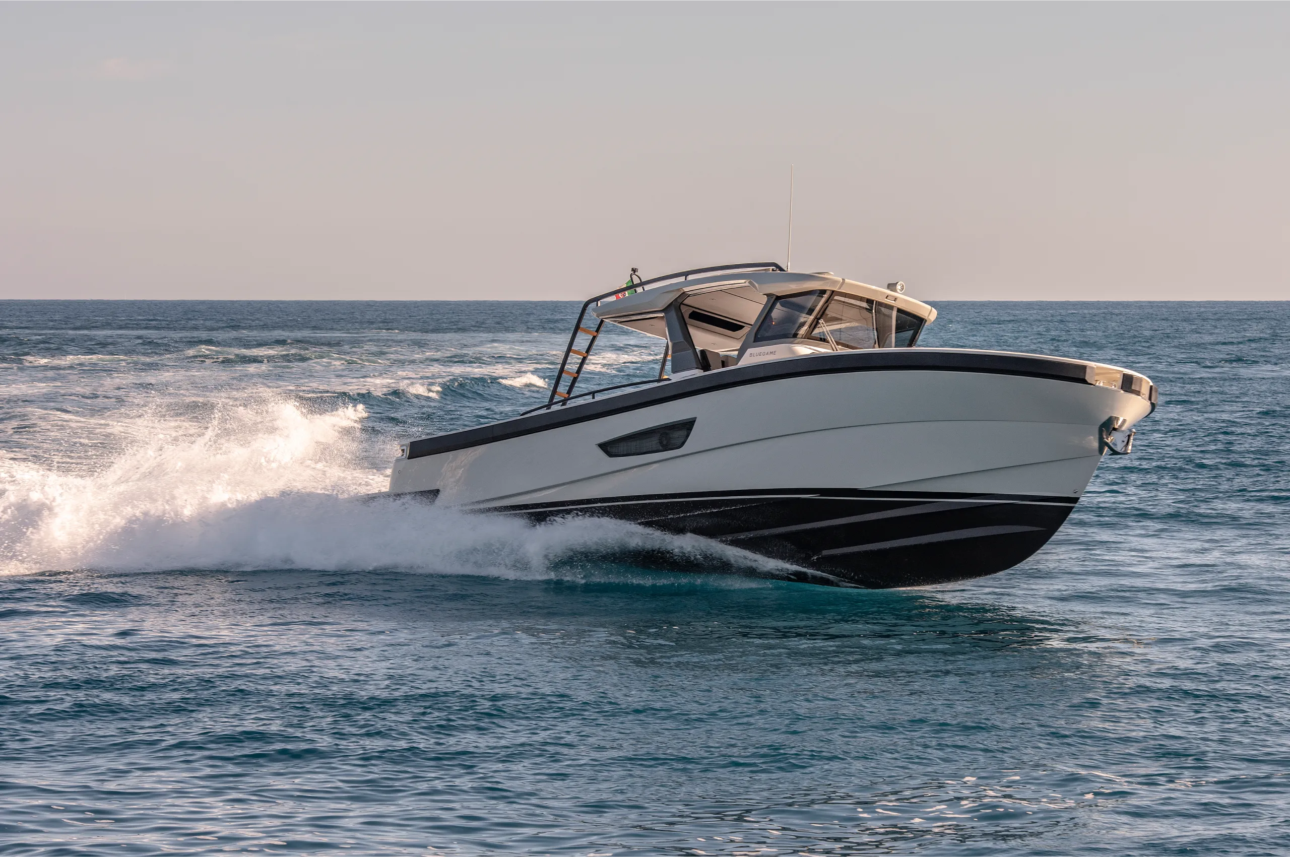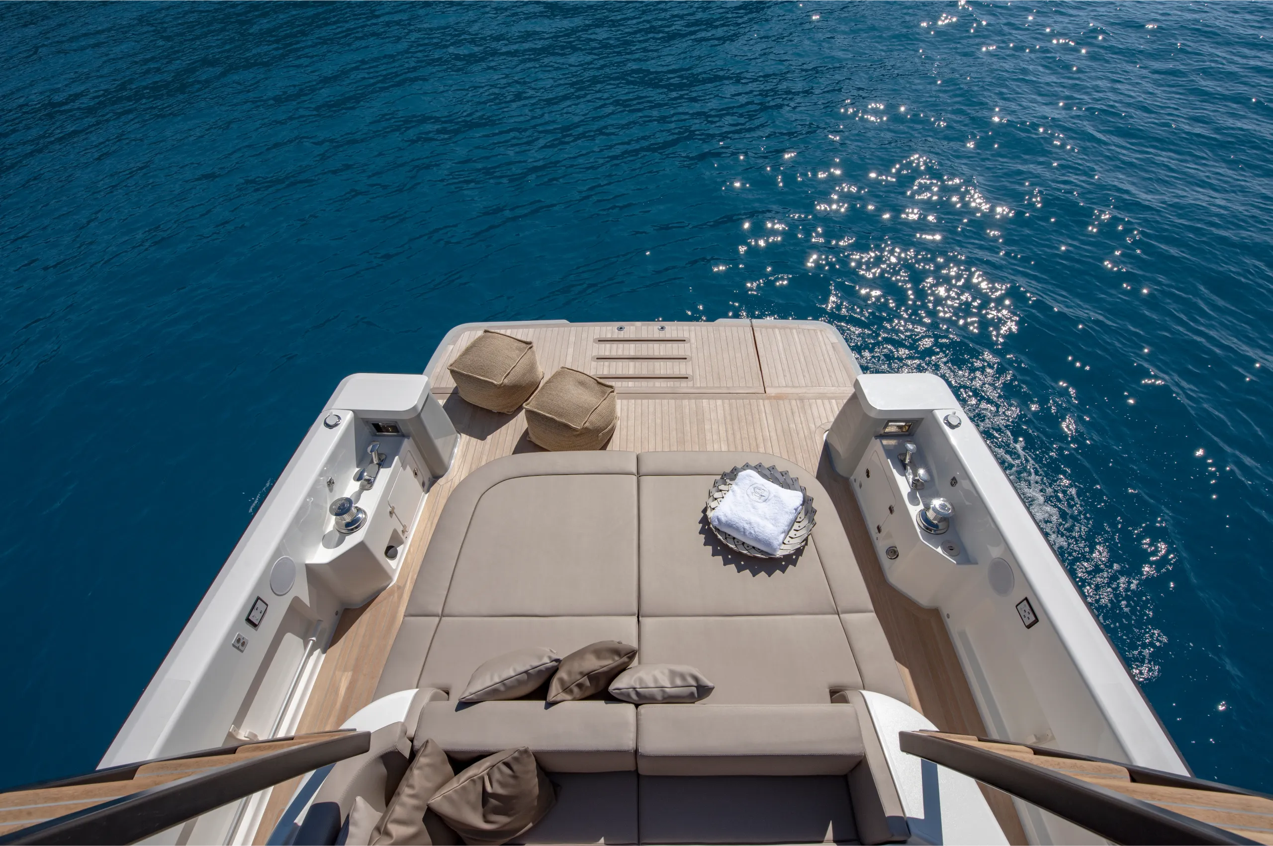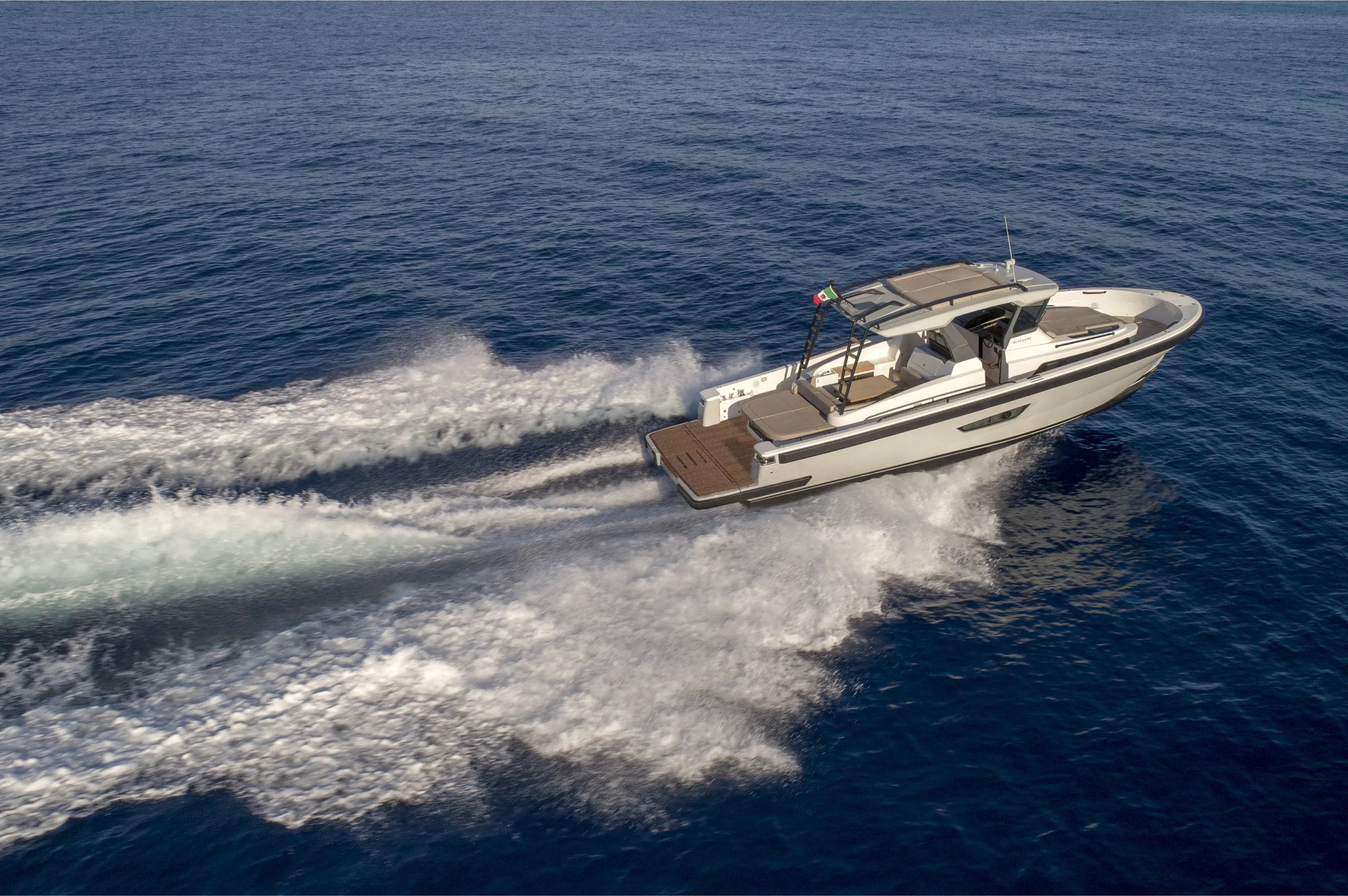 The disruptive BG42 is designed to experience the sea to the full, featuring a spacious cockpit and a full walkaround deck protected by high bulwarks, perfect for secure operations at sea. Exceptional visibility during maneuvers is ensured by the centrally positioned helm station and distinctive reverse windshield. Inside, the clever full-beam layout places a wide owner’s cabin midship with a king-size bed, while the bow hosts a convertible dining area for six people that can be transformed into an additional double bed.