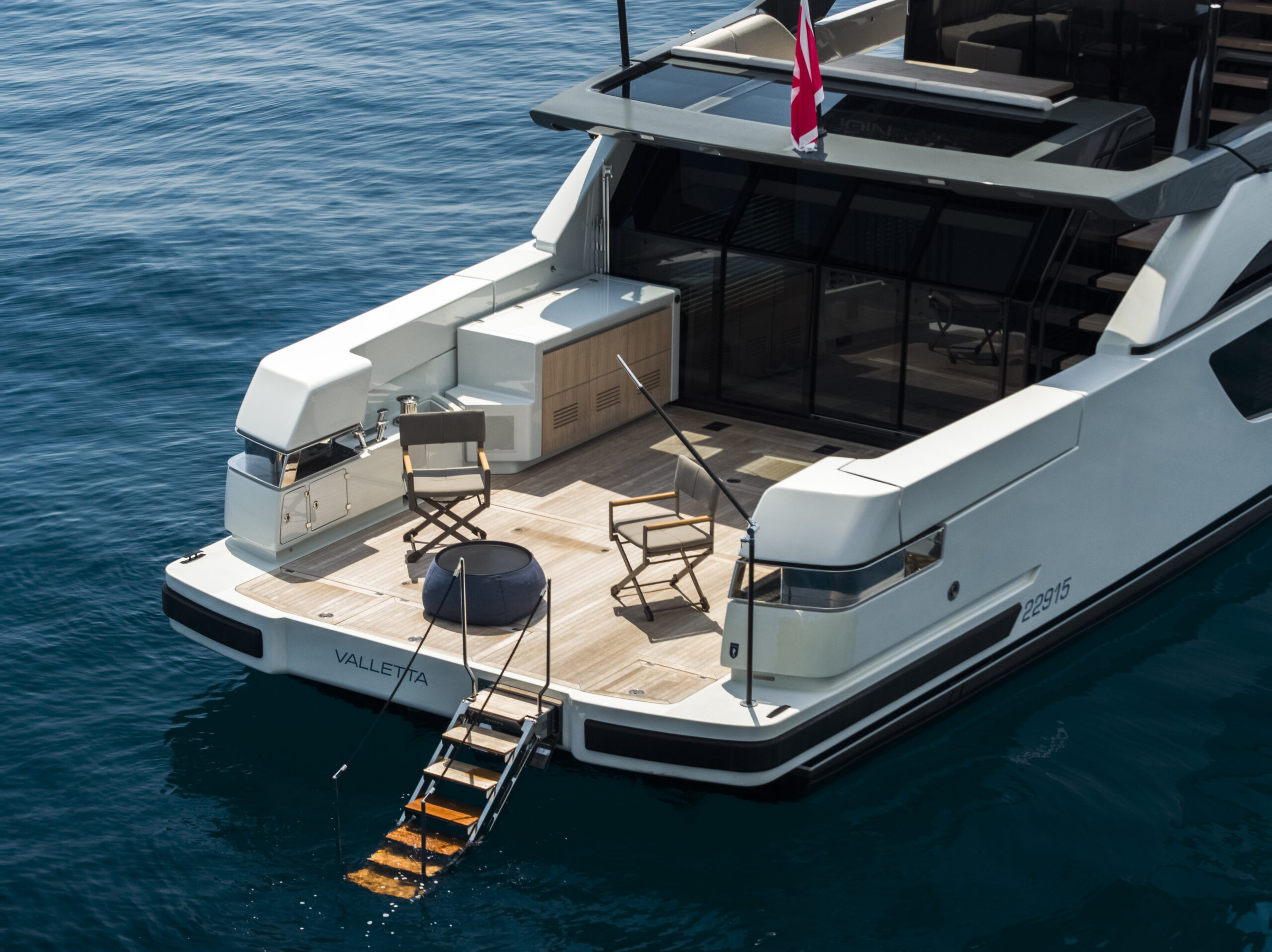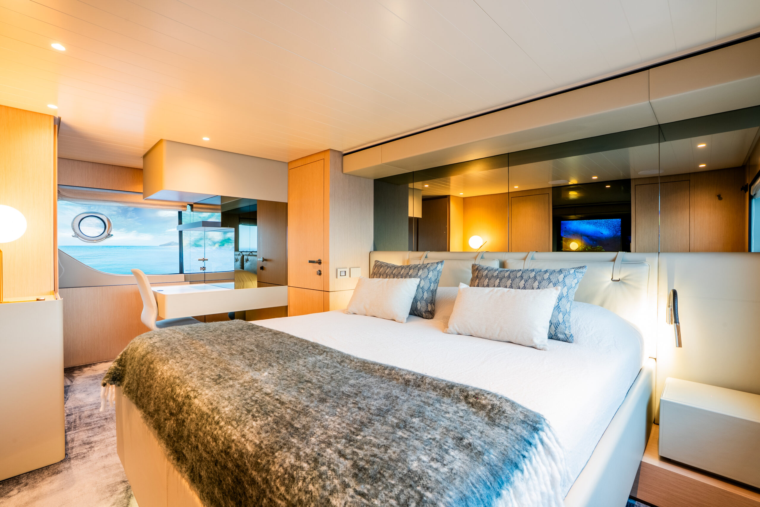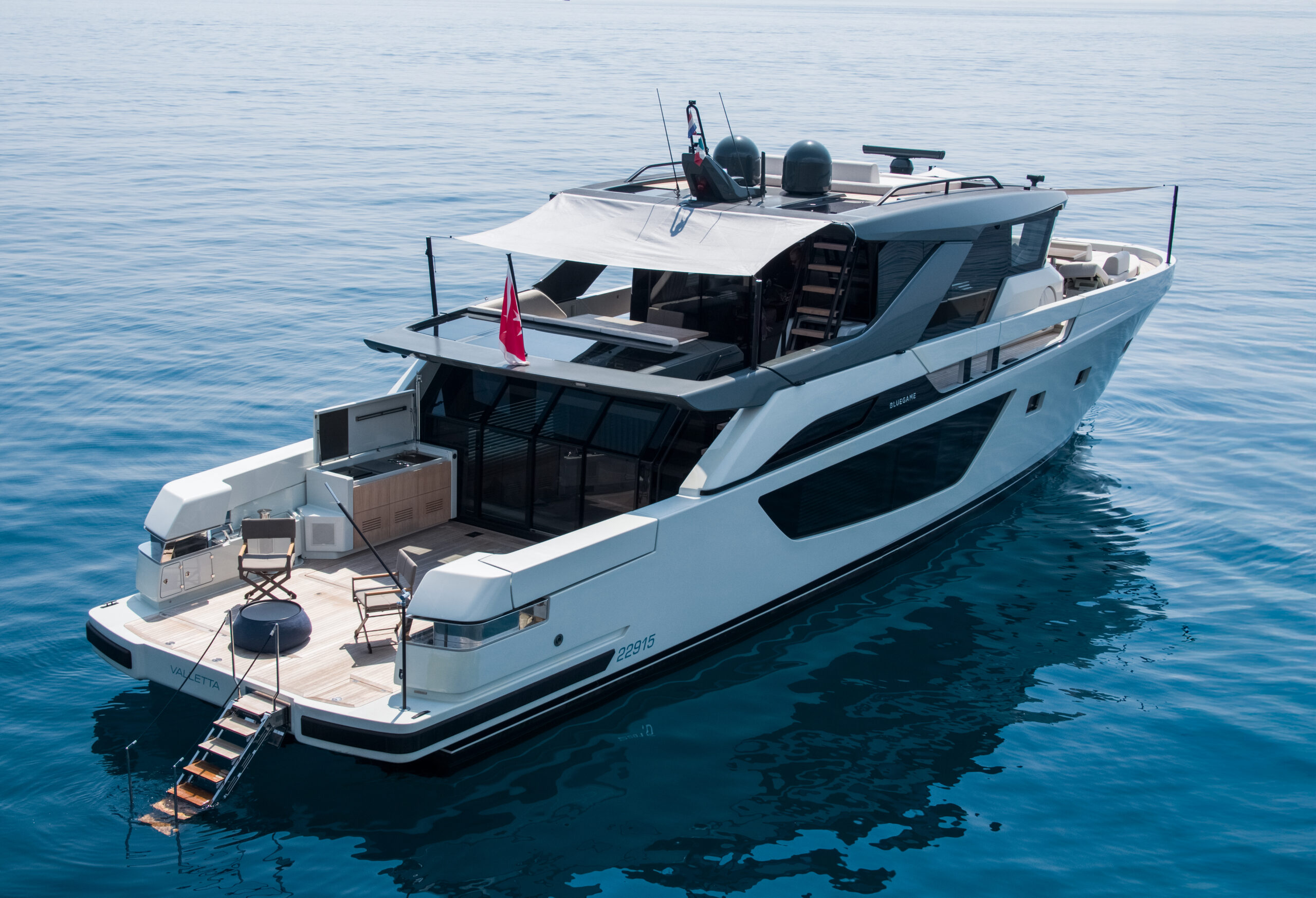 Featuring three spacious cabins, with a door from the owner’s to the guest cabin, this BGX70/BGX73 offers a beautifully designed interior that exudes elegance and functionality. Adding to its exclusivity, a hydraulic platform will be installed at the Bluegame Shipyard, enhancing its versatility and luxury.