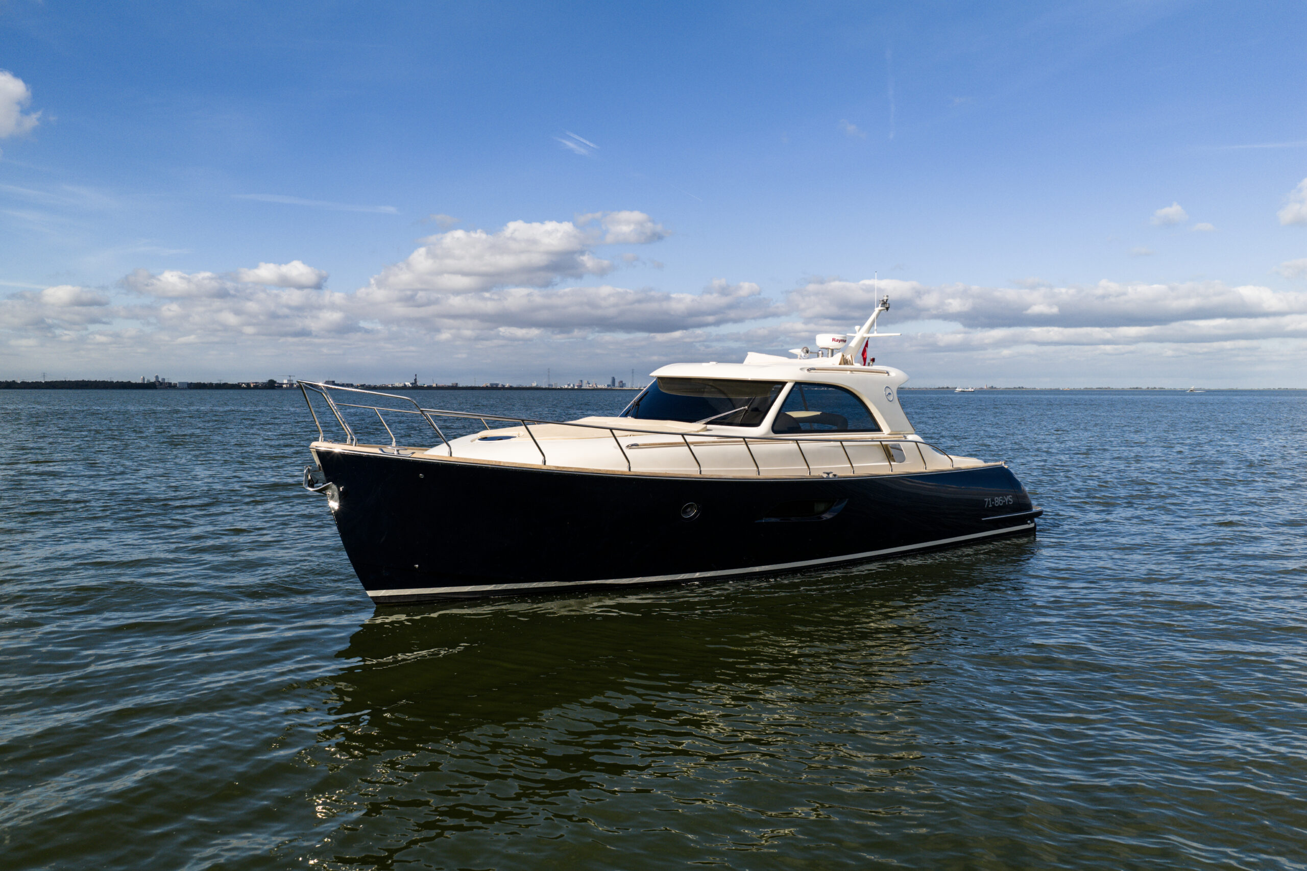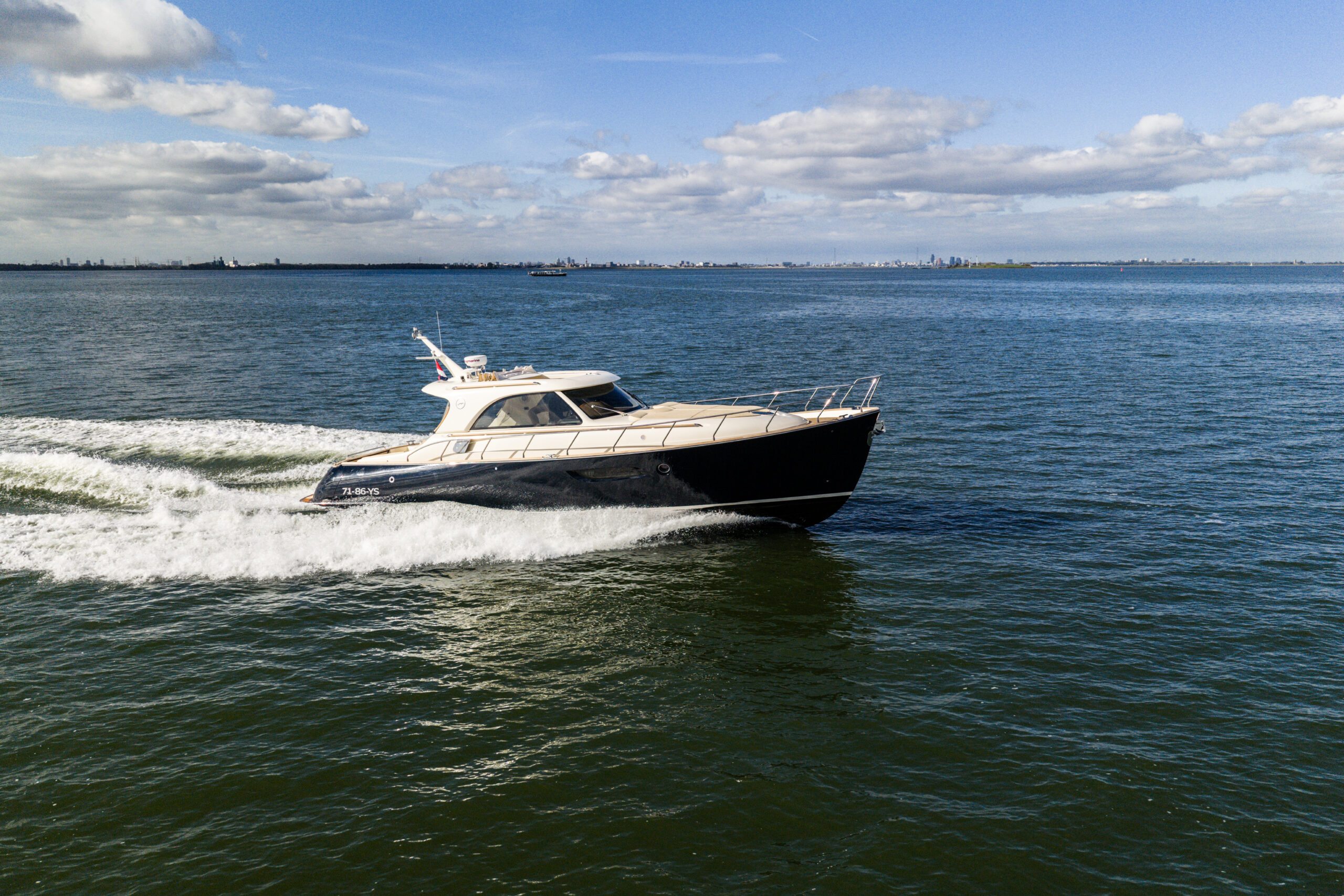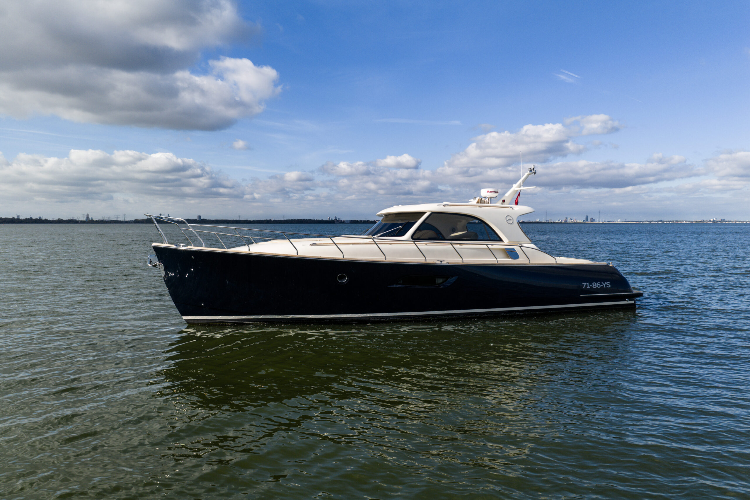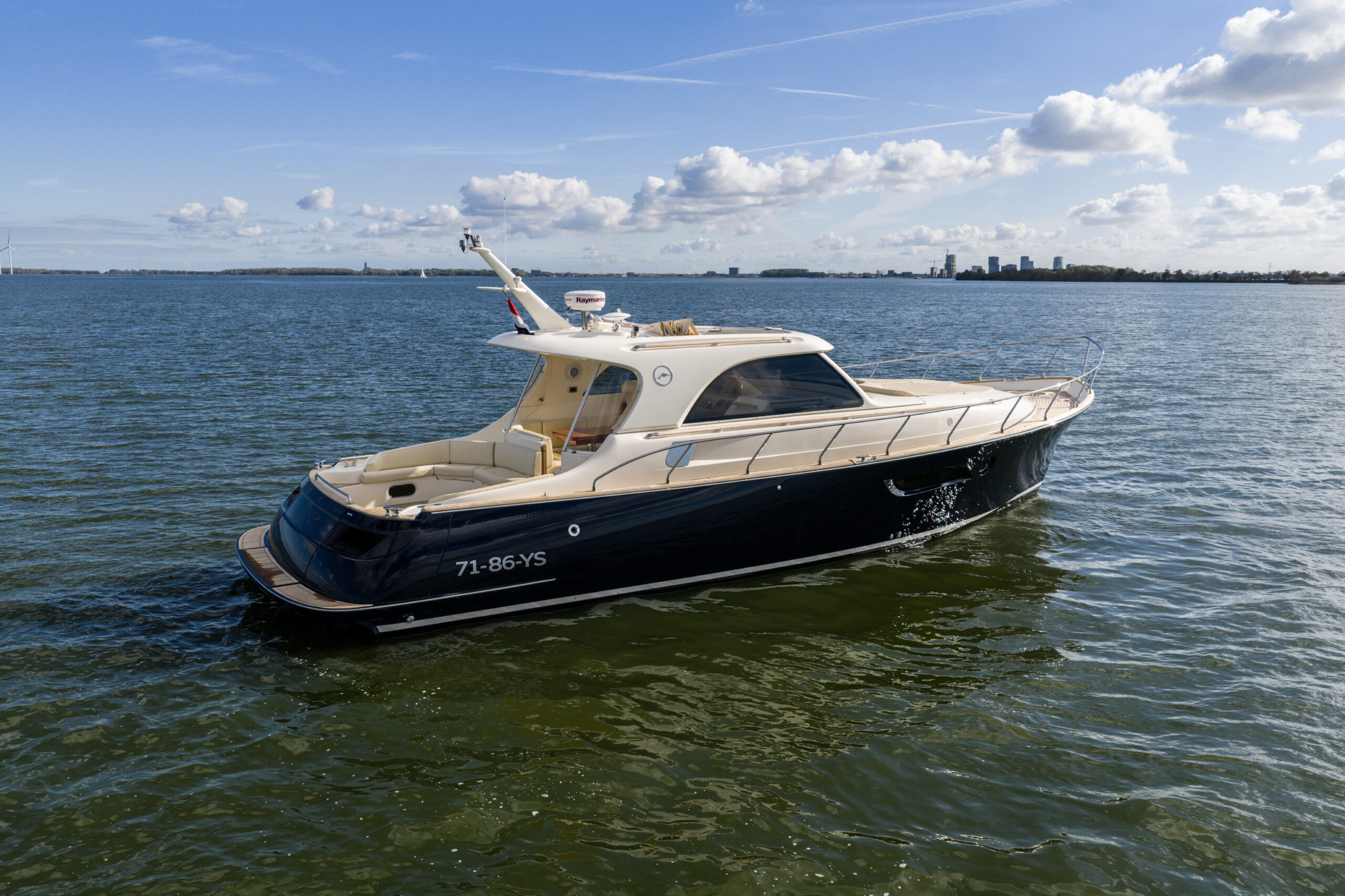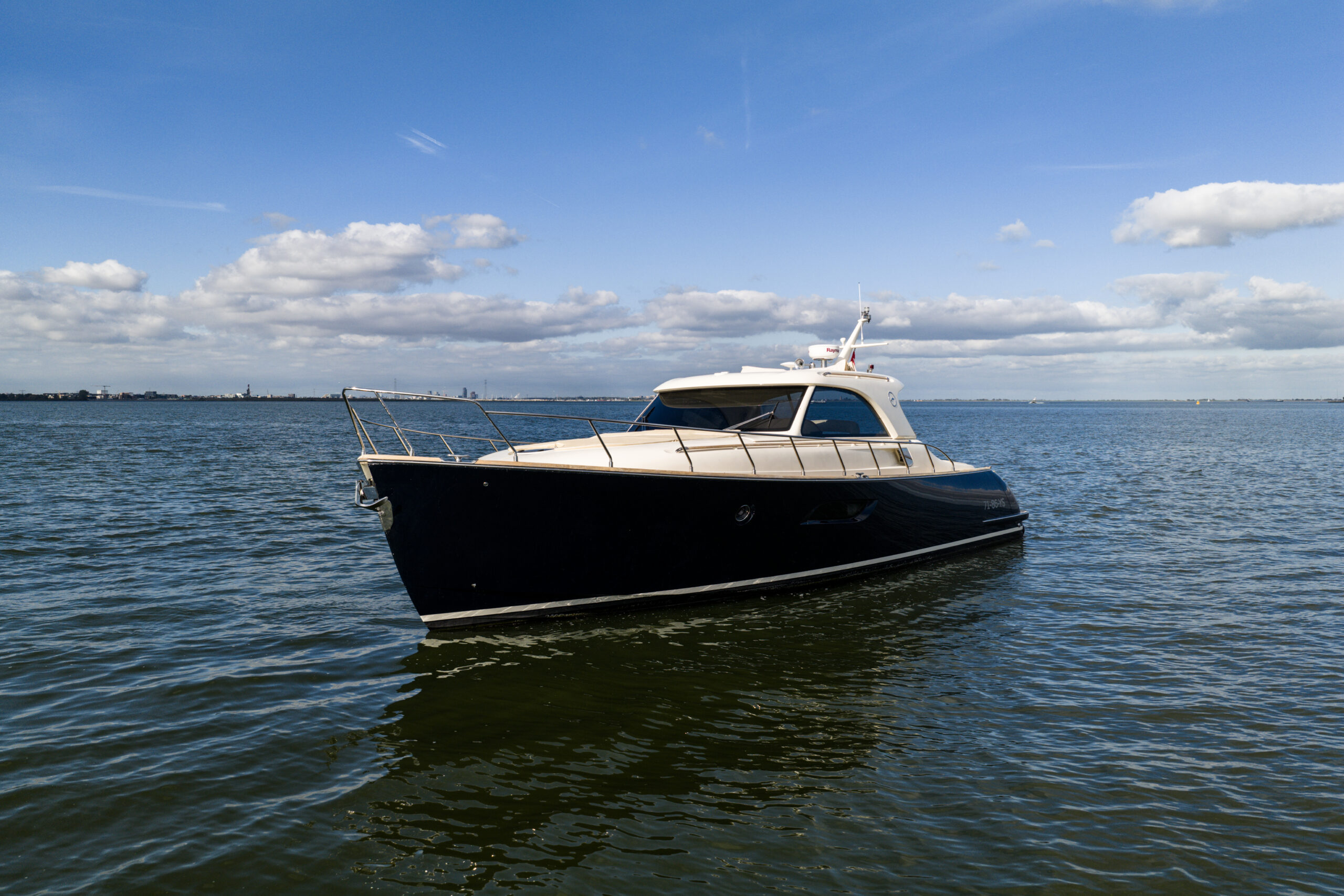 With her elegant curves, deep blue lobster hull, and unmistakable Italian soul, we offer “LA QUERCHIA”, a very well maintained Mochi Craft Dolphin 44 from the year 2012 (commissioned 2013) and built by the Ferretti Group. We delivered her to the first and only owner who used her in The Netherlands on sweet water and only in summertime.