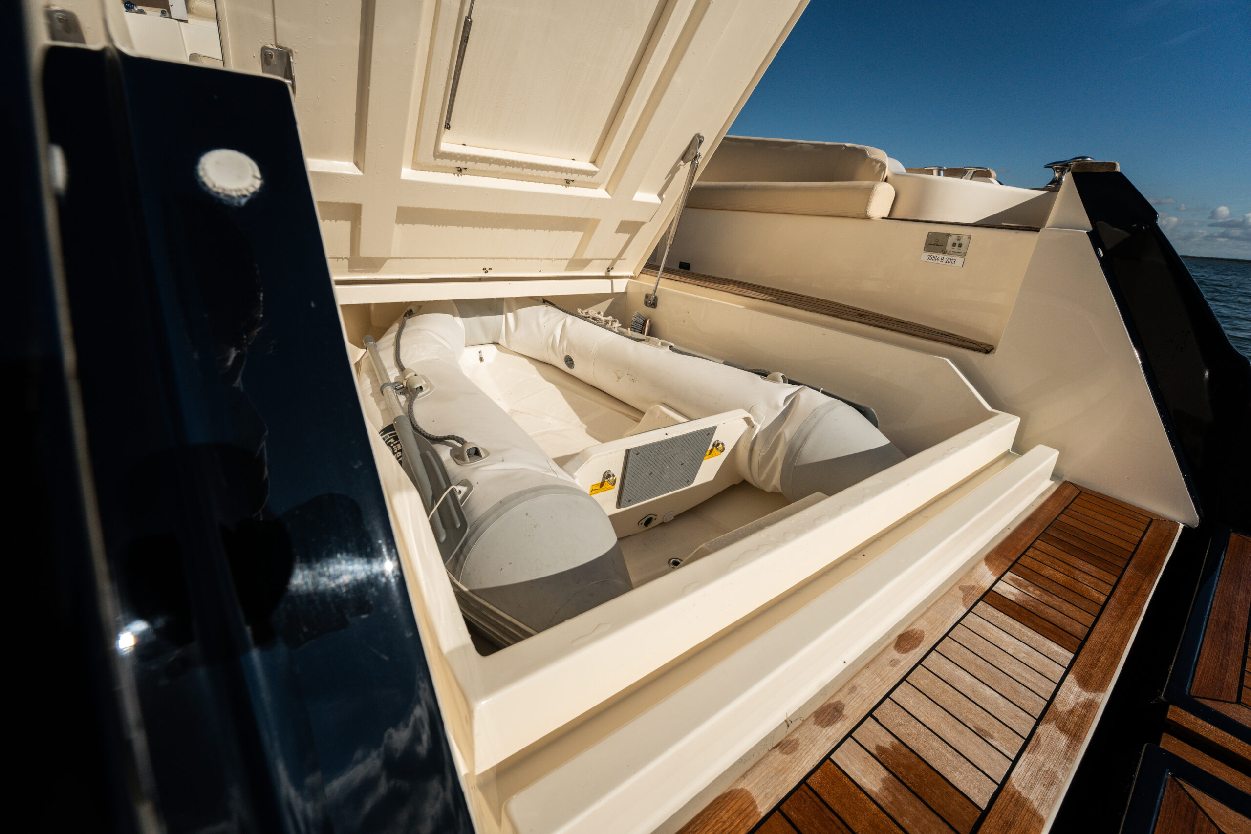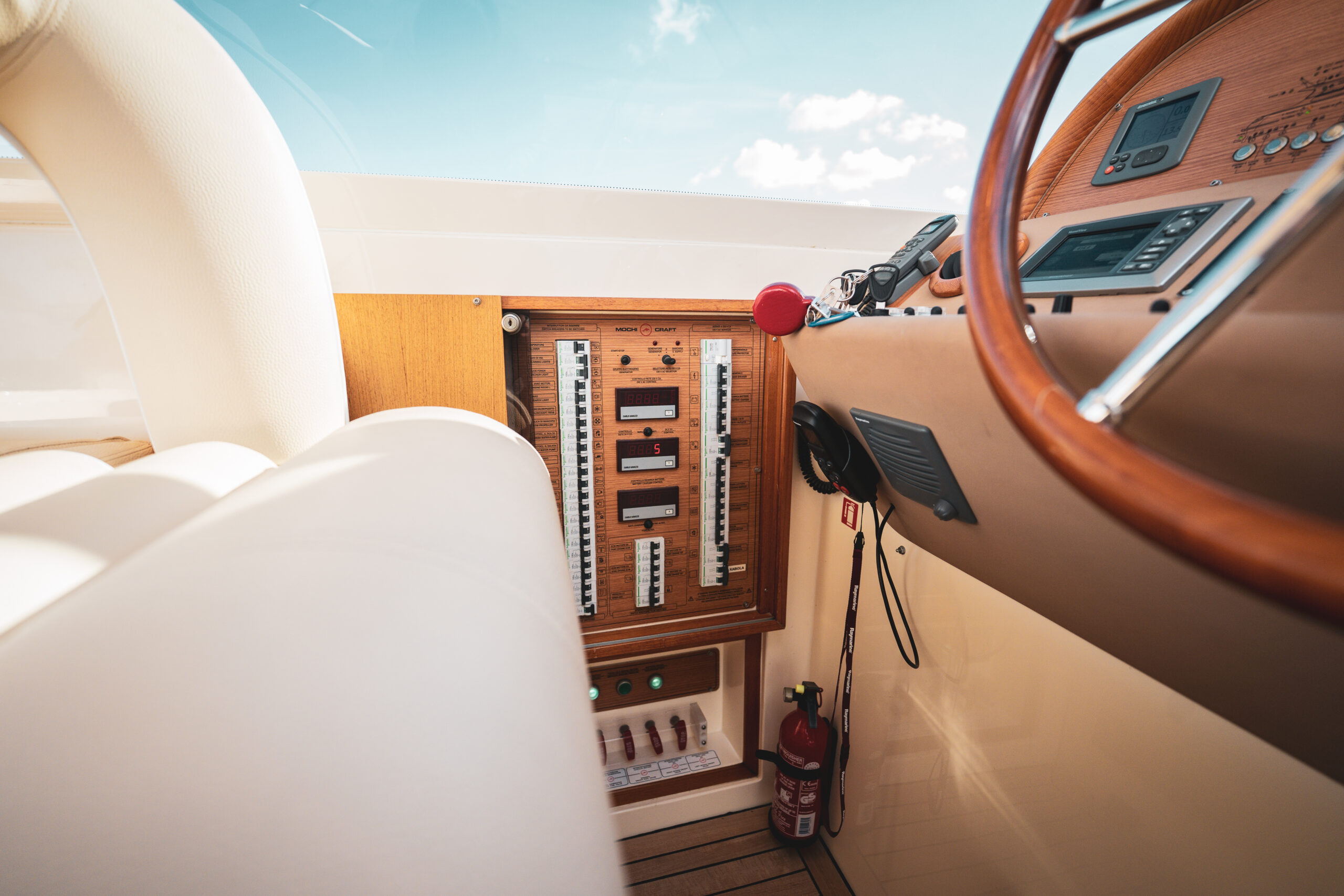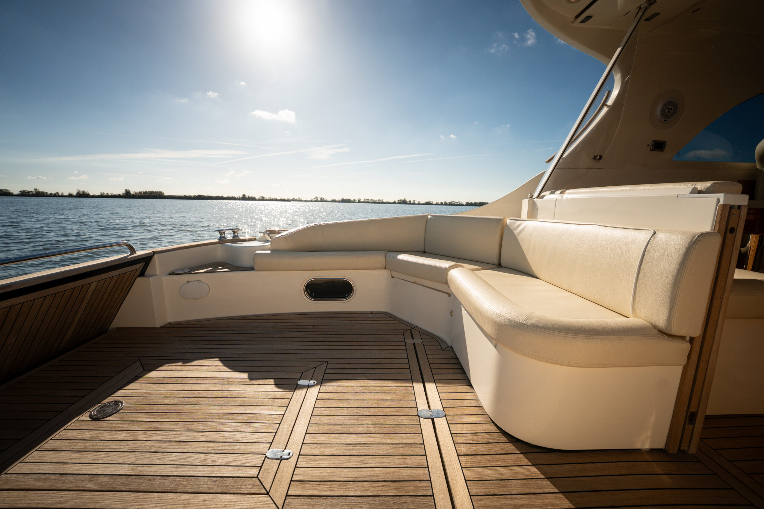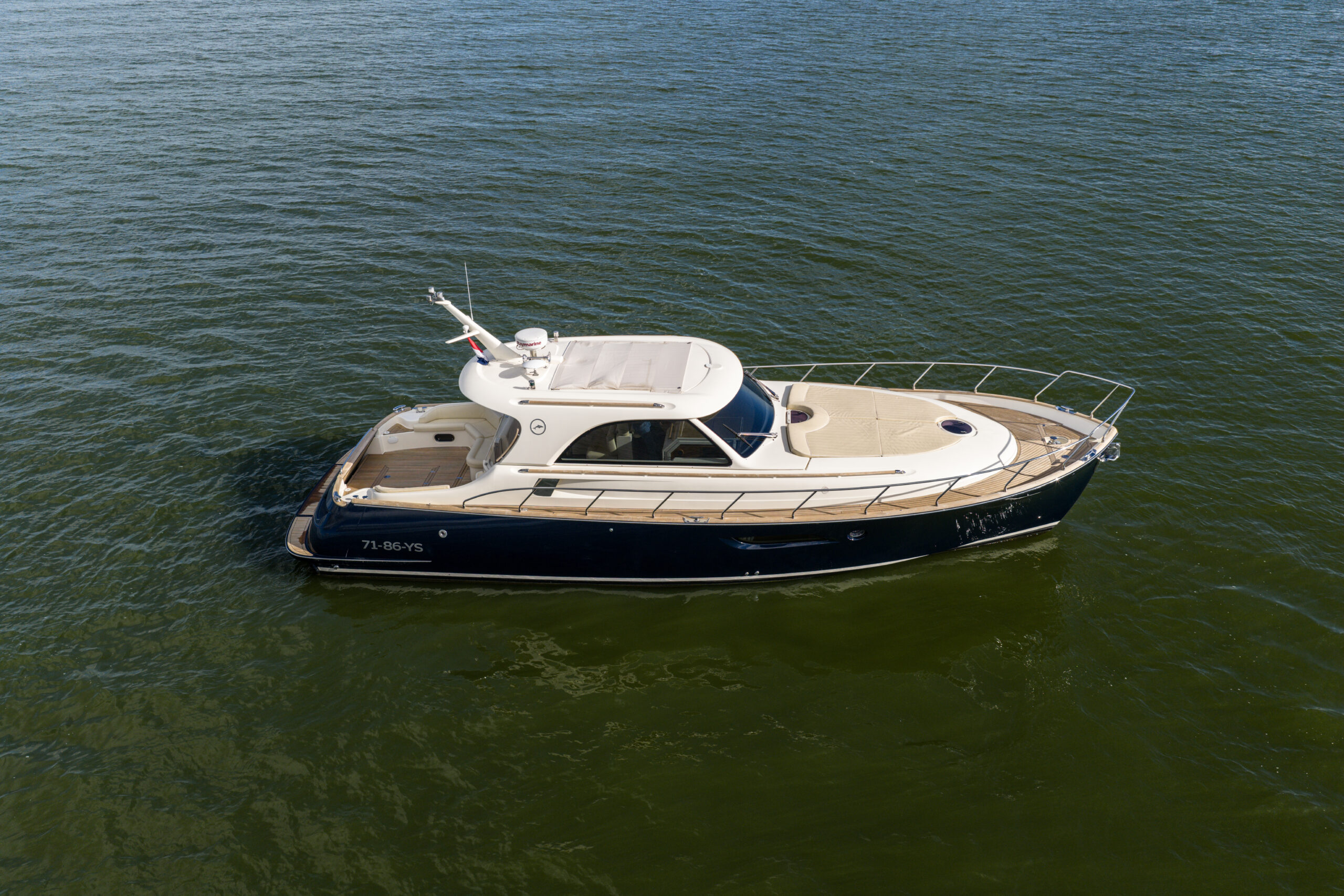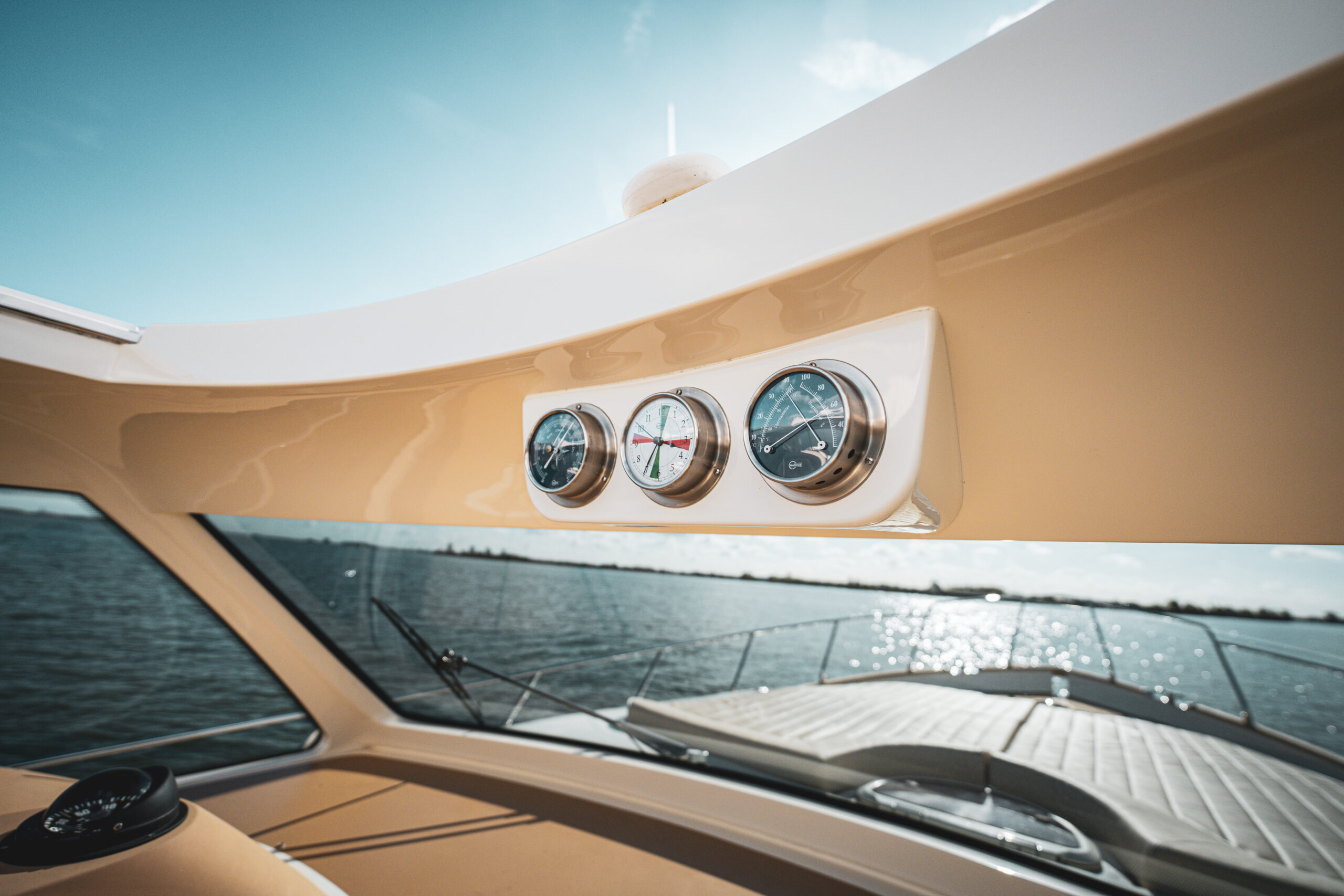 With her elegant curves, deep blue lobster hull, and unmistakable Italian soul, we offer “LA QUERCHIA”, a very well maintained Mochi Craft Dolphin 44 from the year 2012 (commissioned 2013) and built by the Ferretti Group. We delivered her to the first and only owner who used her in The Netherlands on sweet water and only in summertime.
