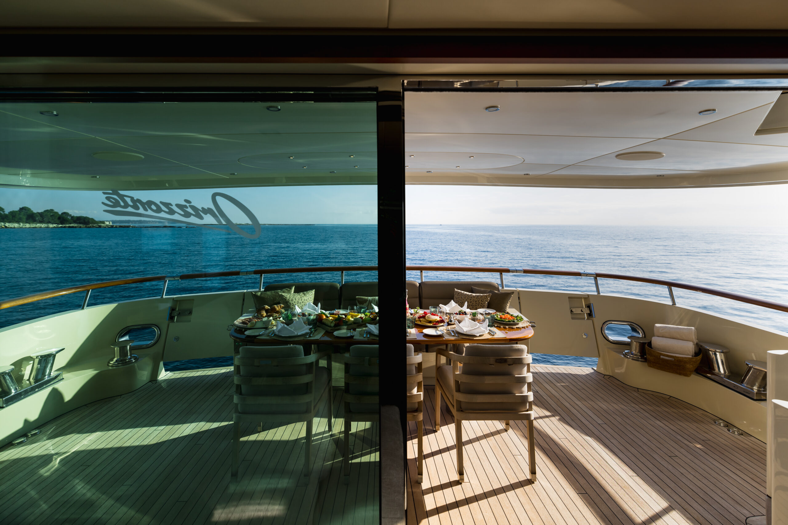 Introducing Orizzonte, the extraordinary 30-meter custom Dutch-built yacht crafted by Vahali in 2020. Elegance flows through each detail of the yacht, gently bouncing off the waves to sweep you away on an enchanting journey from the picturesque southern French archipelago to the charming foothills of Italy. As the sun sets, step inside to discover a world of sophisticated elegance. The interior seamlessly combines varied textiles, rich dark woods, and a light-hued ceiling, creating an inviting and exclusive atmosphere. The lounge, with the spacious dining setup and cozy sofa cluster facing a TV, is the perfect retreat for unwinding. Each cabin, accommodating 8 guests across 1 master, 2 VIPs, and 1 double cabin, exudes warmth, luxury, and ample space. The bathrooms, adorned with stone tiles, glass shower doors, and subtle silver details, breathe timeless sophistication.