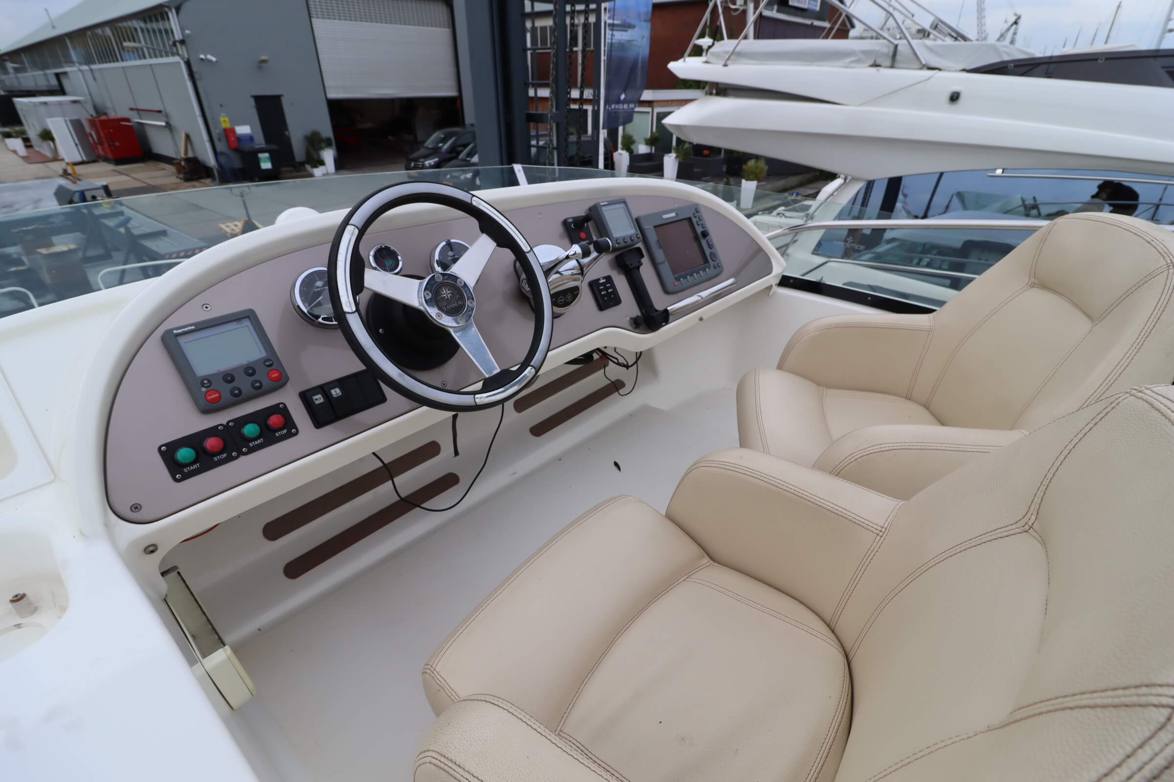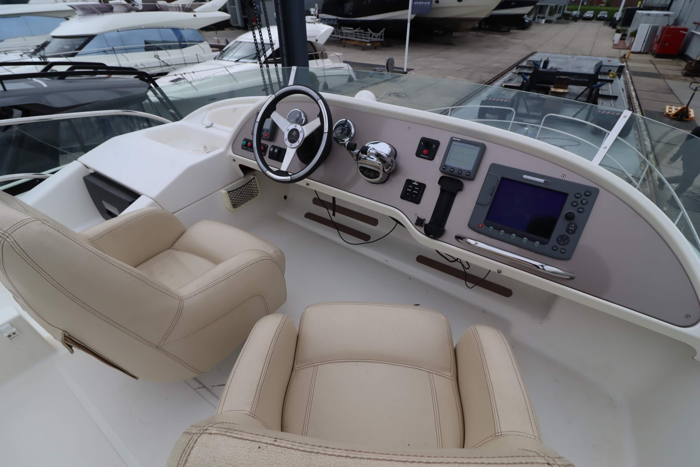 This Jeauneau Prestige 42 Fly was located in Croatia and is in very good condition. After purchase by the last owner, the entire ship was generally refitted and many things were exchanged and worked up. The whole service and inspection work was carried out annually. The boat is equipped with a cabin and a master cabin, 2 full bathrooms with shower and electric toilet. The spacious living and kitchen area is carpeted. All cabins and living area have SAT reception and TV sets. Terrace and bathing platform are covered with teak. There are covers in the very matching dark green tone as cockpit- and flybridgepersenning.