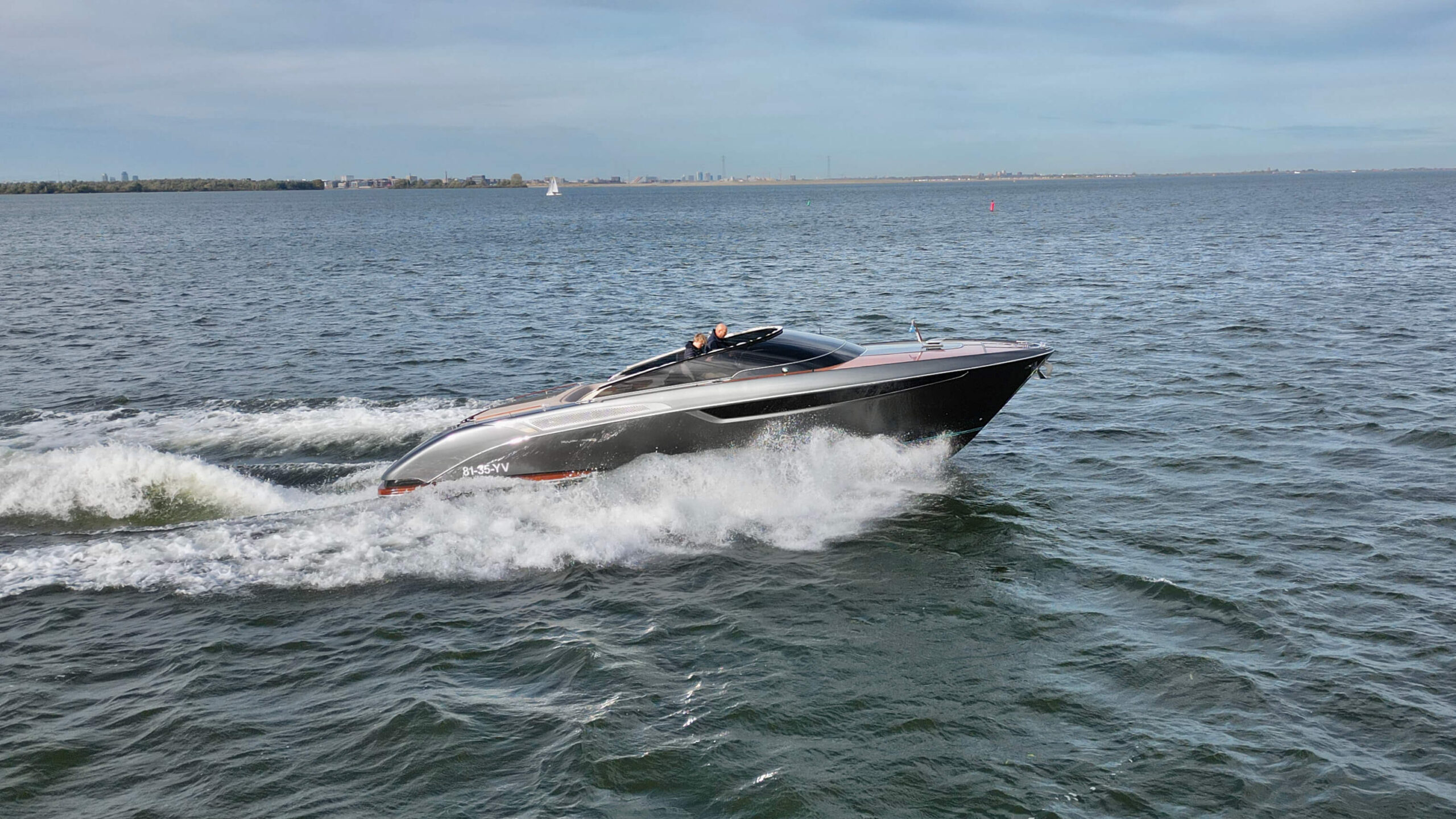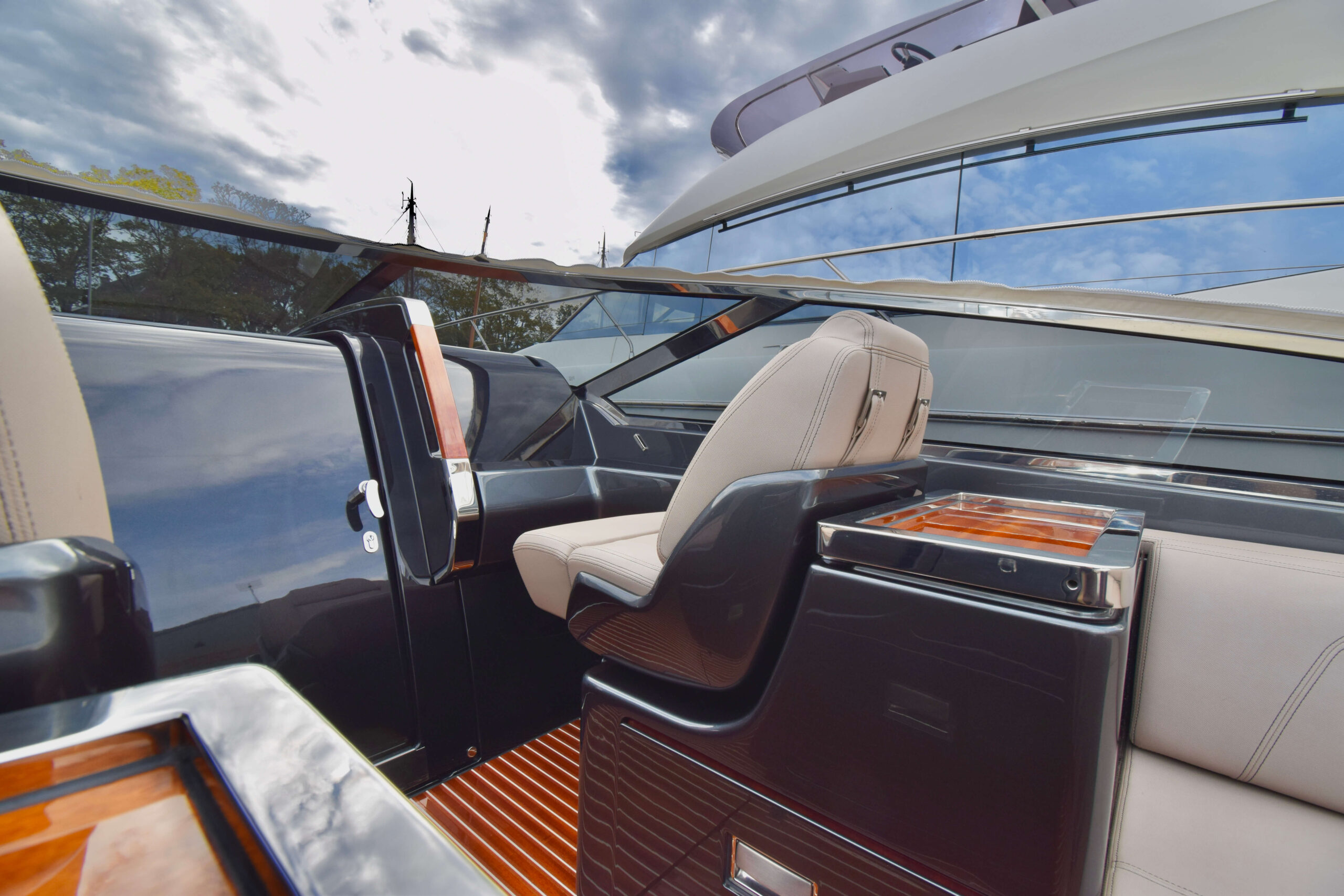With its sinuous and sleek lines, the new model looks seductive and sporty as soon as you set your eyes on it. The boat’s profile has a distinctive double-curved laminated crystal window at the level of the cabin. The most eye-catching feature on the deck is the windscreen, consisting of 5 double-curved laminated crystal glass sections set in a stainless steel frame, fitted with a rail for the cockpit cover.