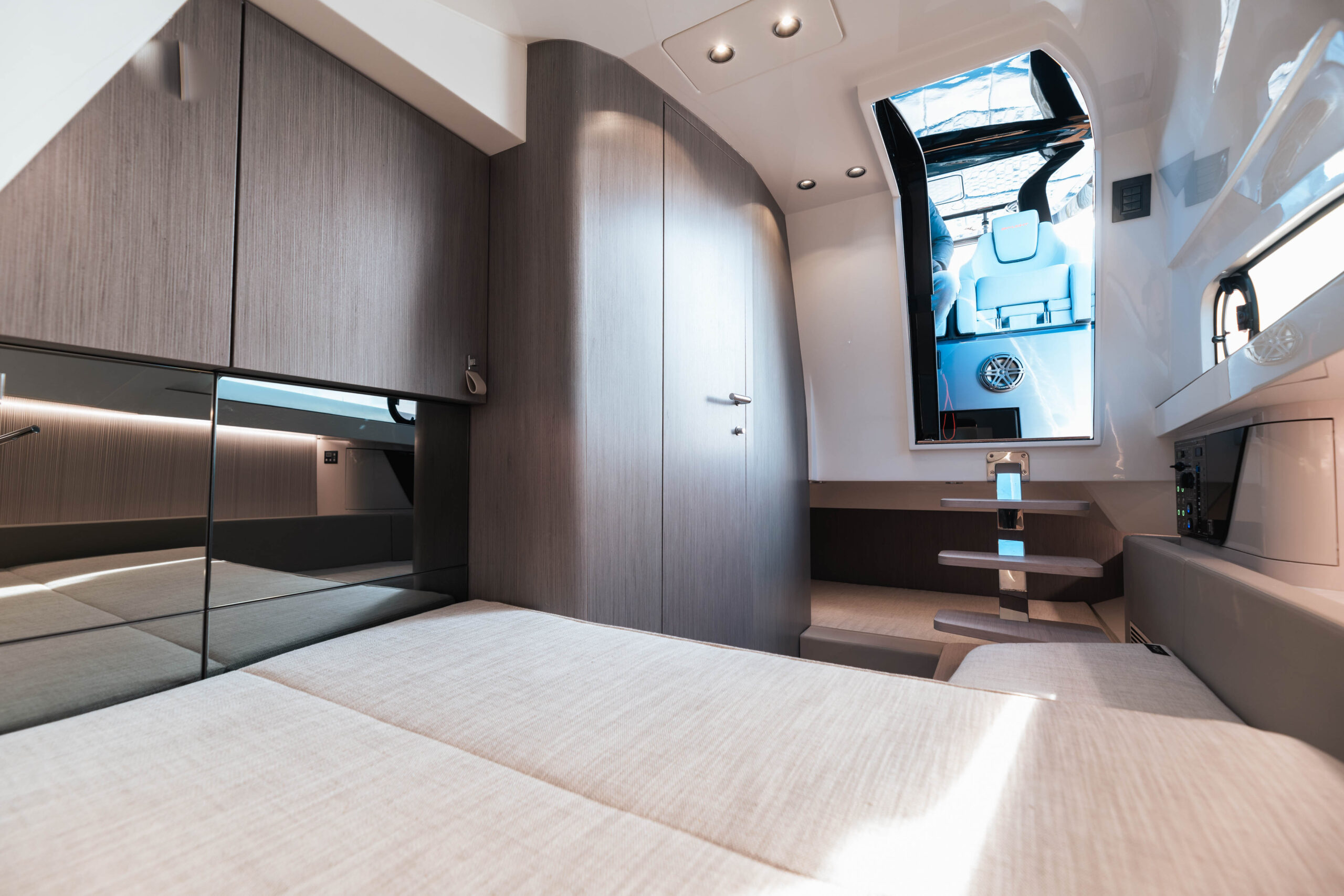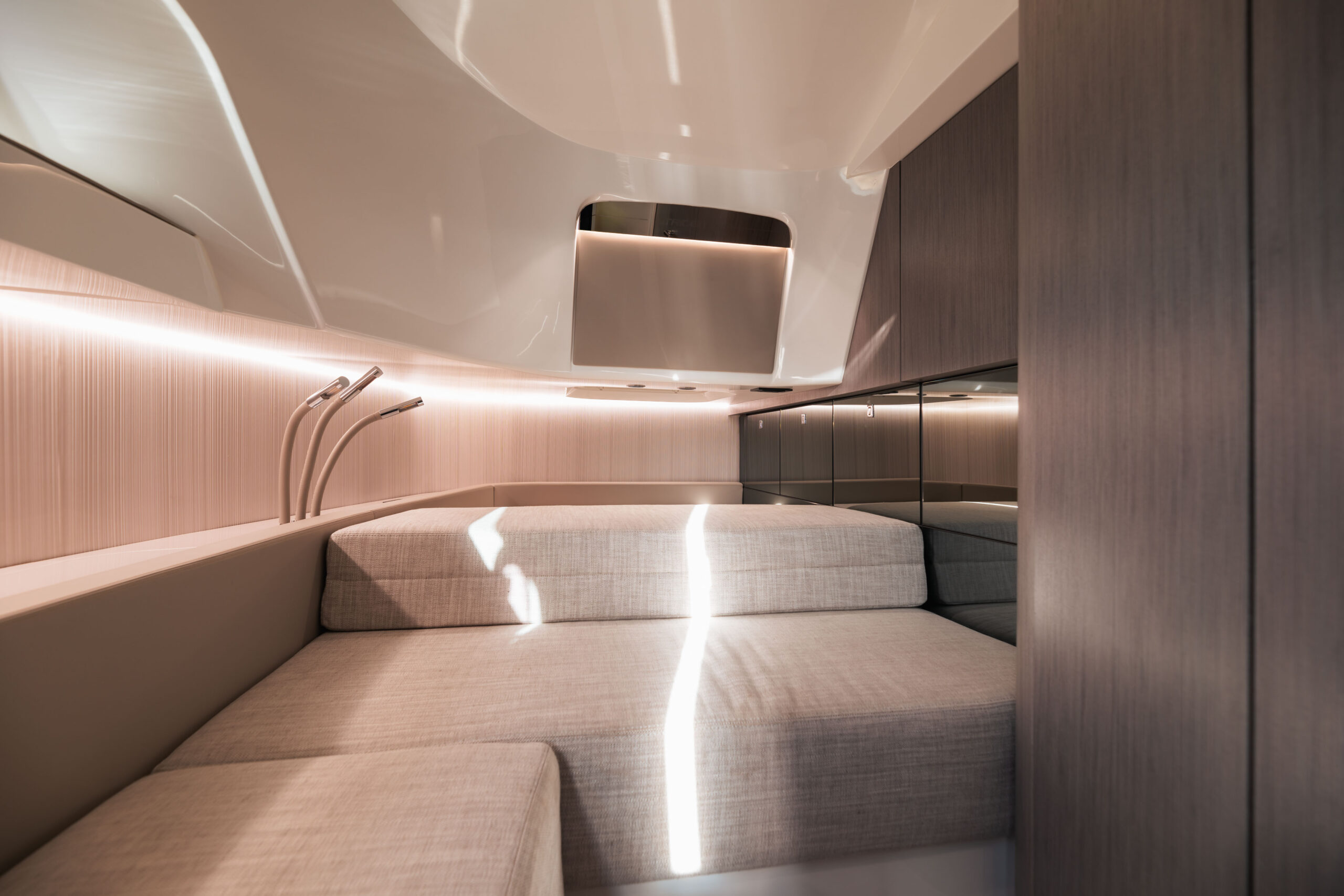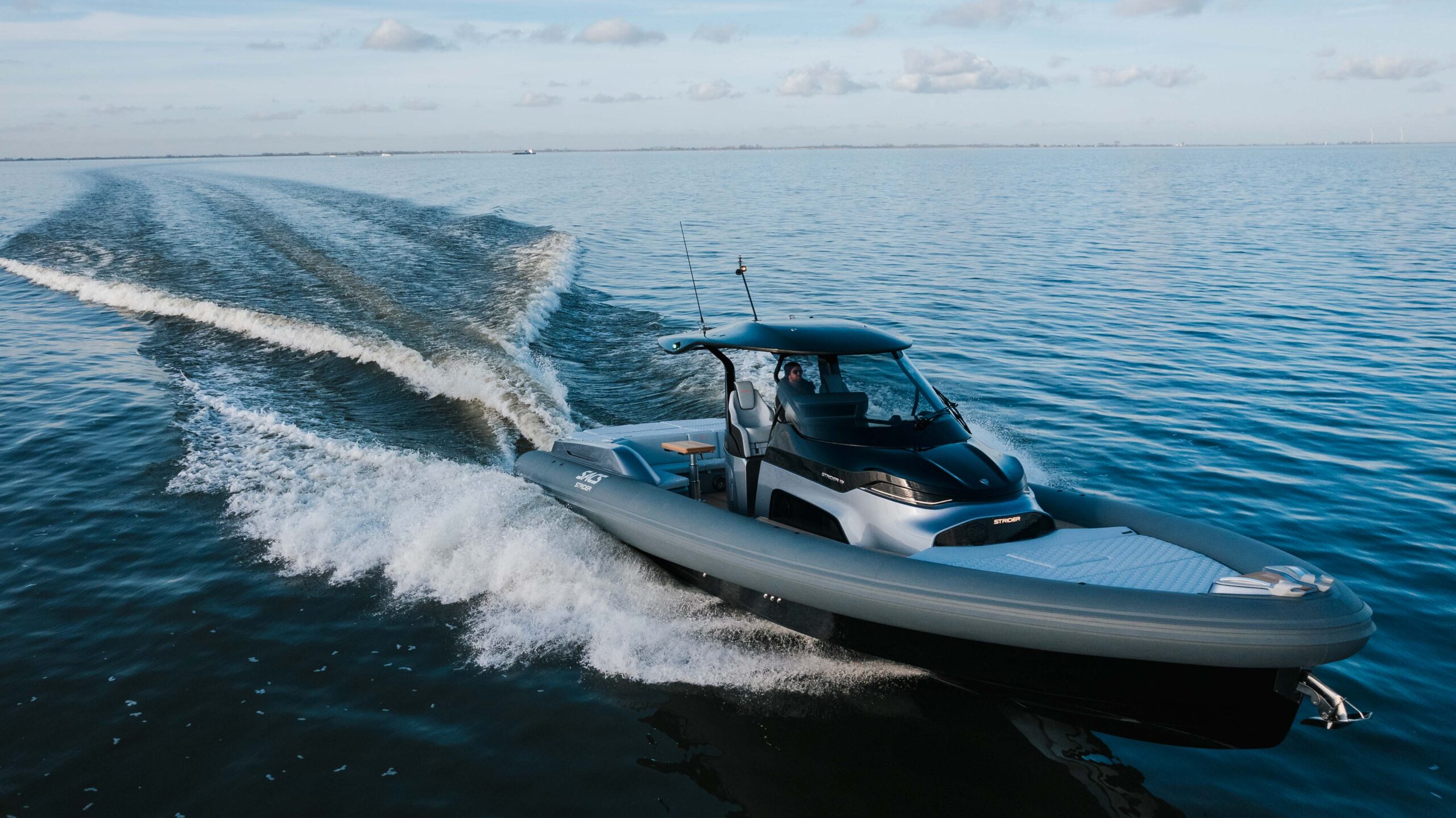 After over a decade of successful production, the iconic Sacs Strider 13 has undergone a complete transformation. Launched at the Cannes Yachting Festival in September 2024, this renewd model boasts a brand-new hull and an innovative design. The updated Strider 13 features a spacious two-cabin layout, increased beam, and a more powerful, muscular profile, setting a new standard for the line. This unique new stock model, exclusive to Lengers Yachts, showcases a stunning Skylight color palette in the upholstery, complemented by fresh, bright orange accents inspired by the Lengers Yachts signature colors. Known as the Skylight Edition, she is the first and only model of her kind, fully painted in custom metallic silver with a sleek black hardtop and elegant carbon grey tubes.