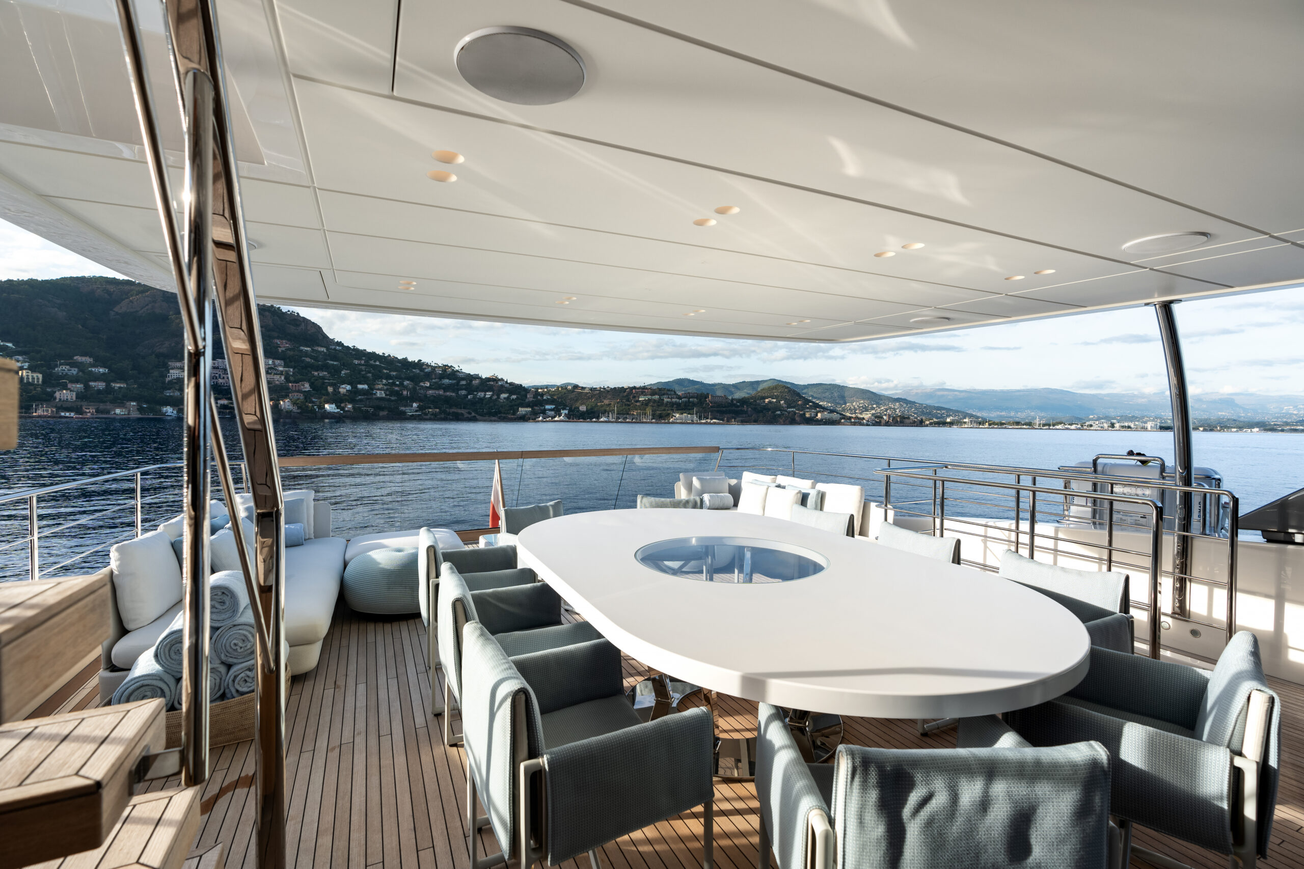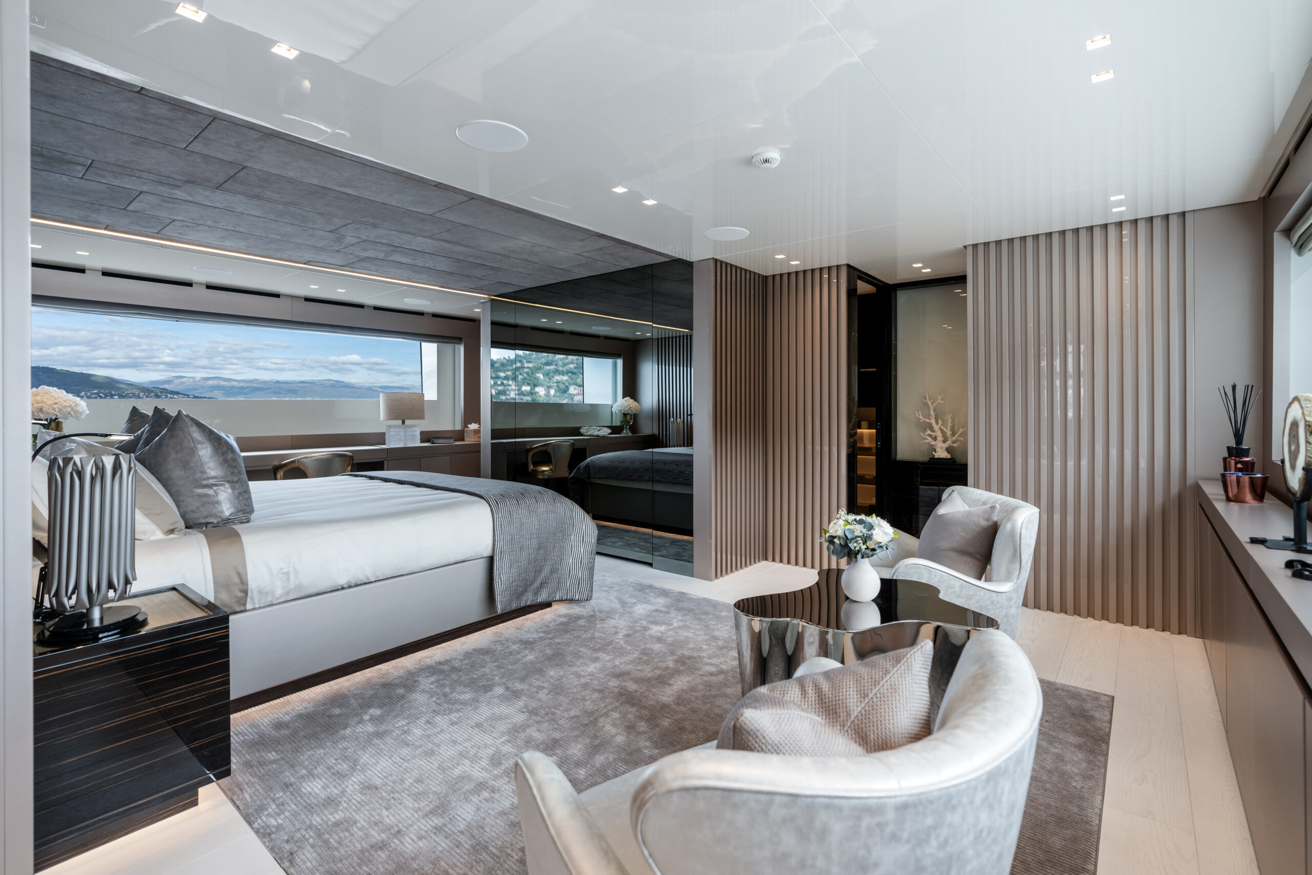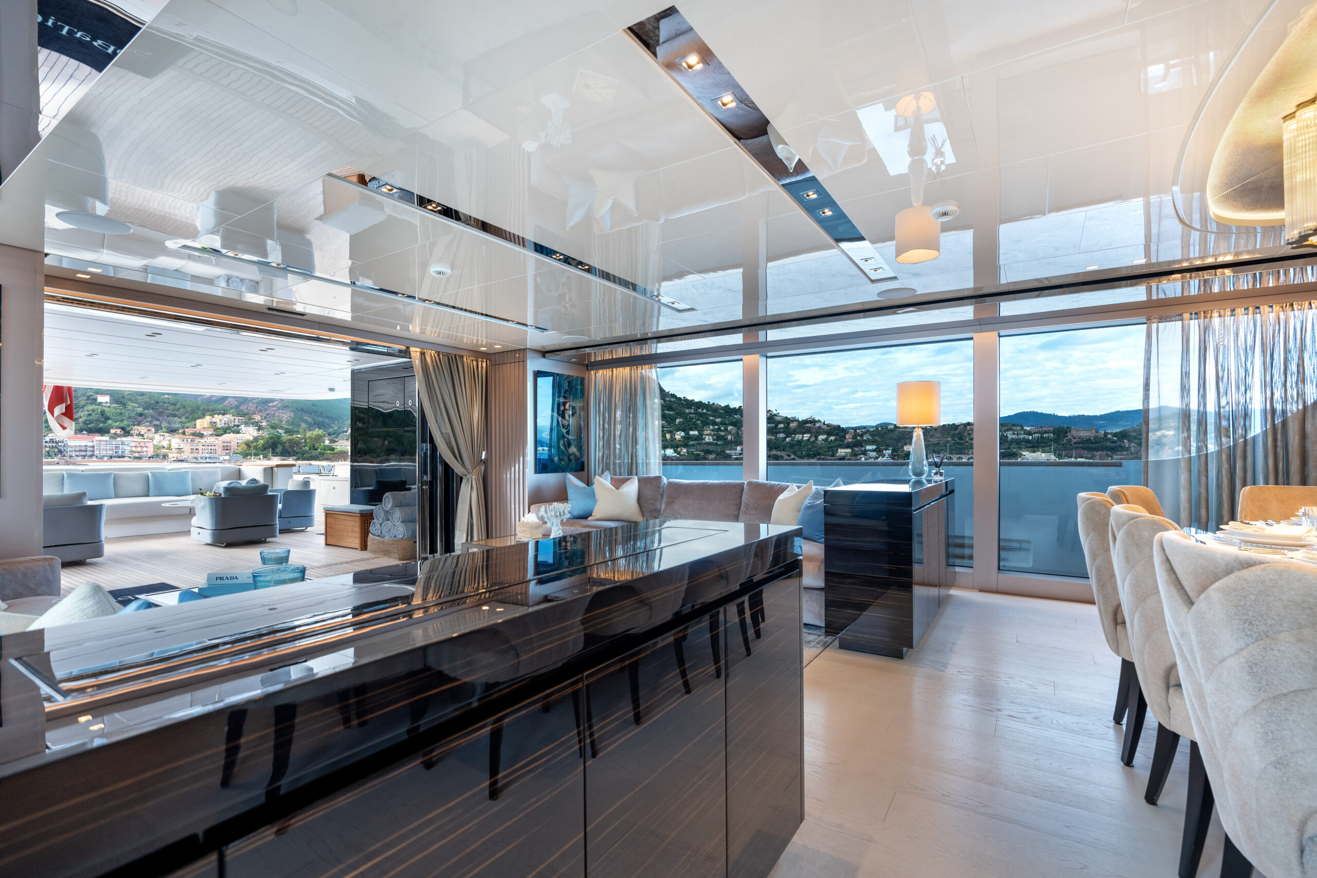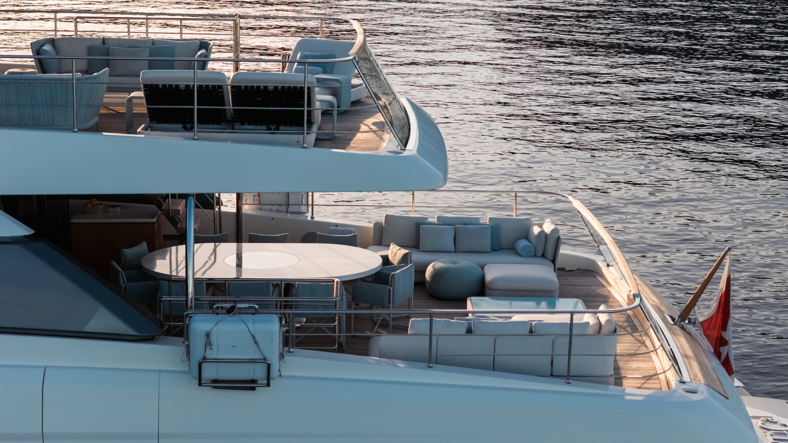 Registered under the Maltese commercial flag, she offers complete flexibility for private cruising or charter operation. Her asymmetric upper deck and wide-body layout create an exceptional sense of space and seamless flow between interior and exterior areas. The three-sided beach club with fold-down terraces transforms into a spectacular, water-level living area which is unmatched in her class. The owner’s suite on the main deck features private access to the foredeck lounge, providing an intimate and sheltered retreat.
