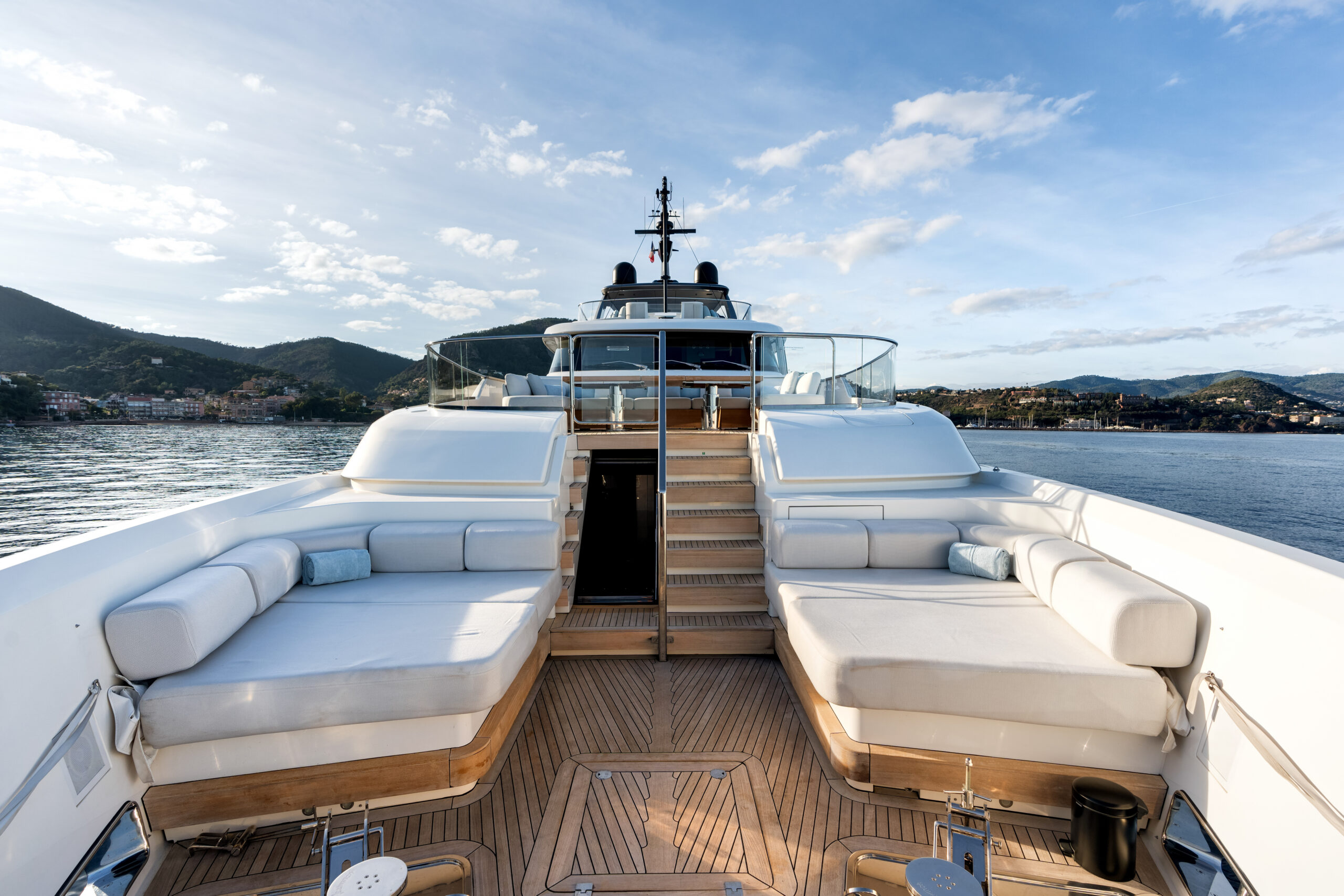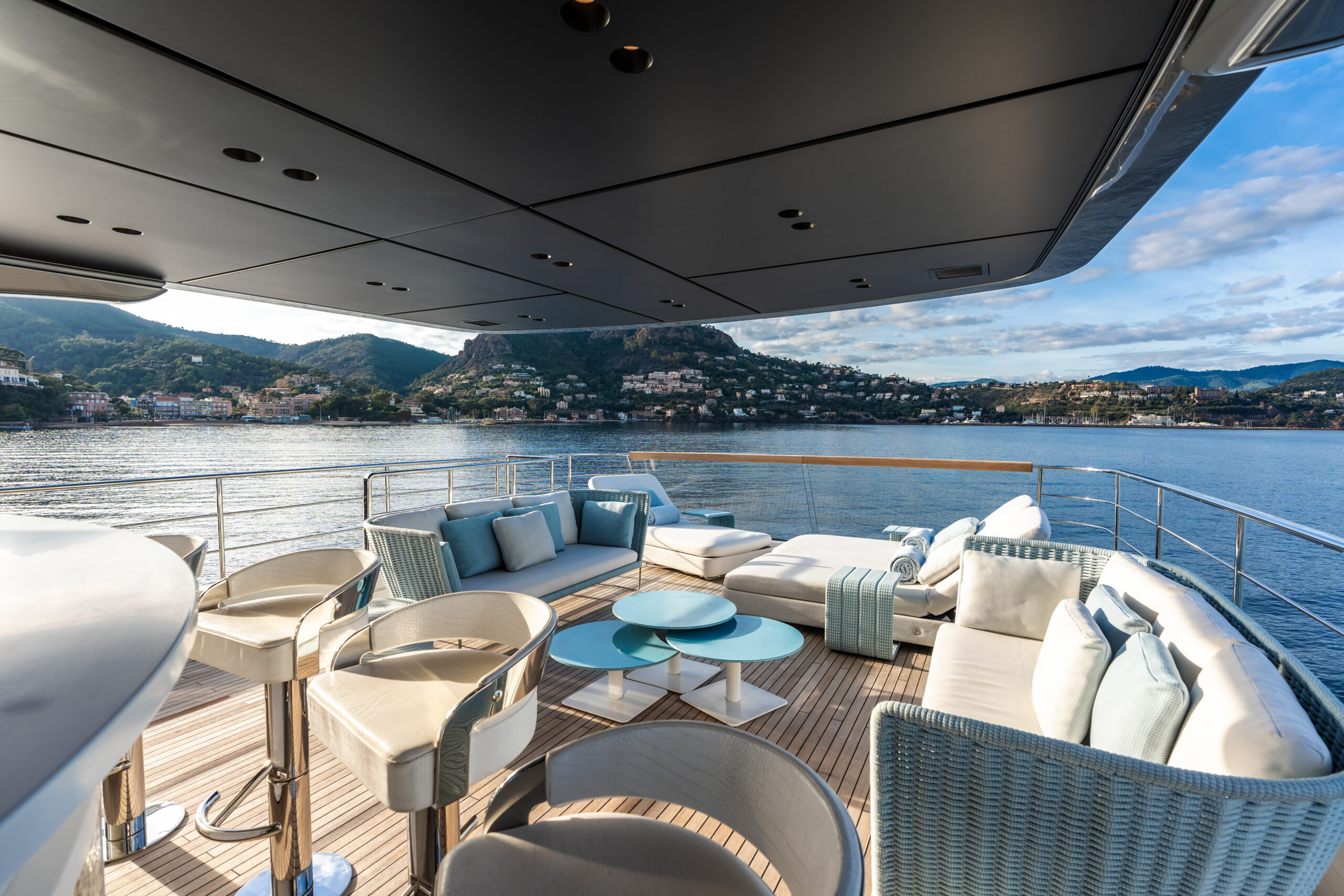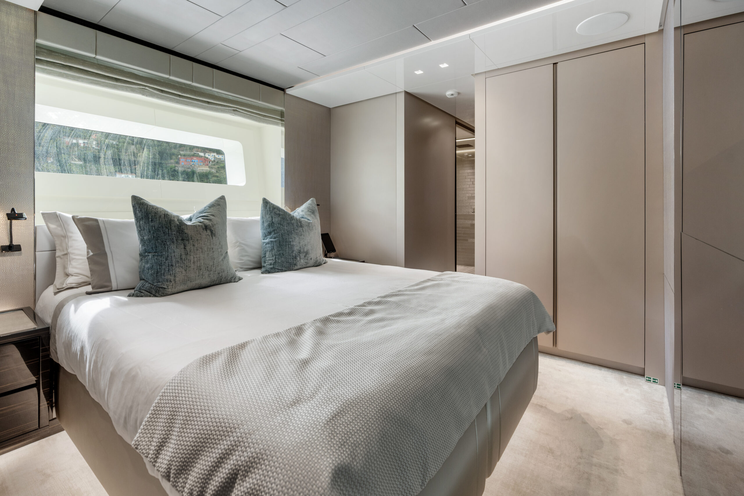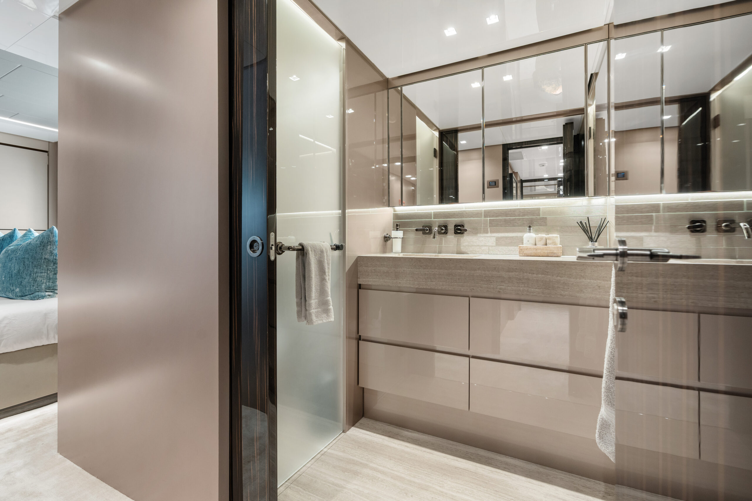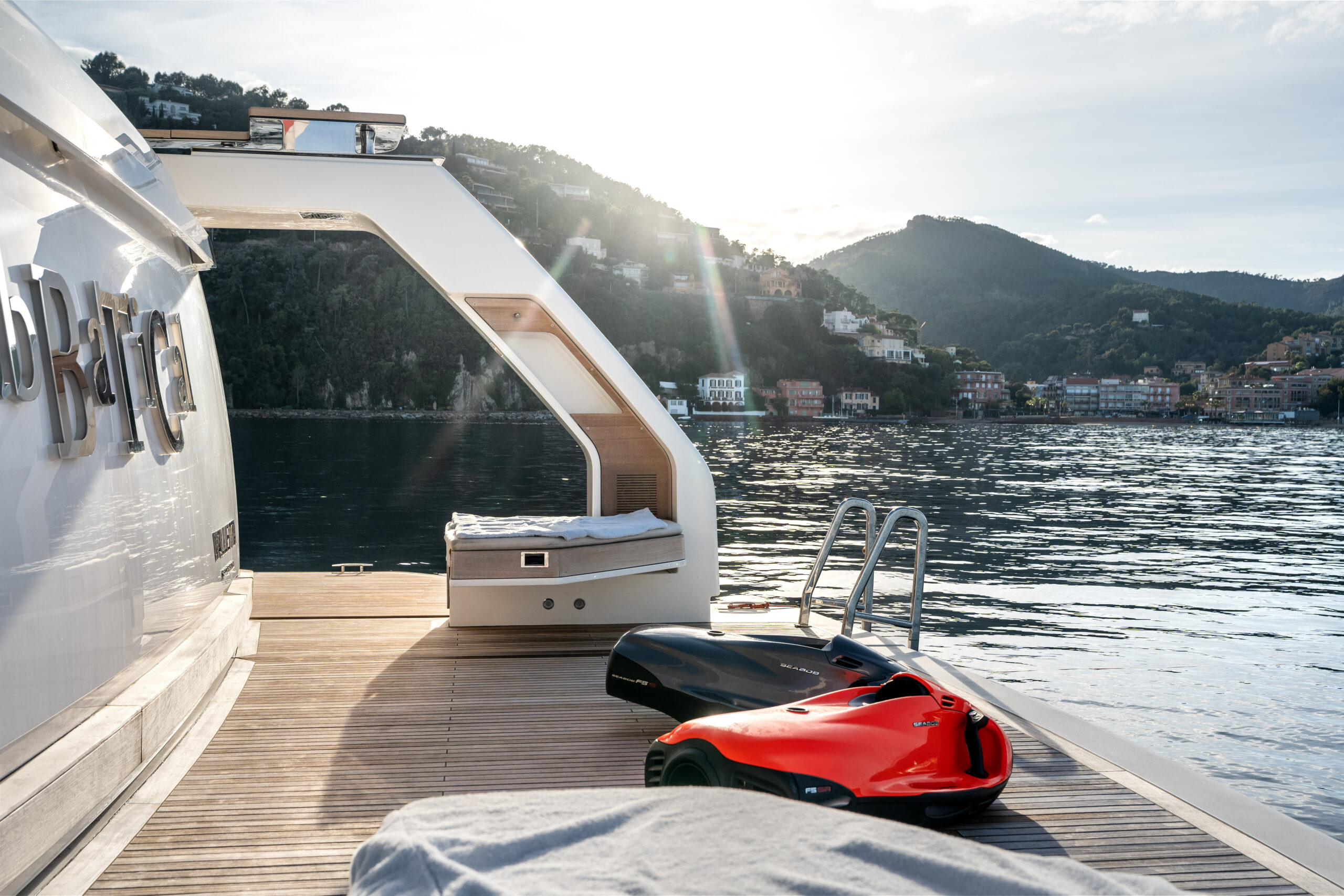 Registered under the Maltese commercial flag, she offers complete flexibility for private cruising or charter operation. Her asymmetric upper deck and wide-body layout create an exceptional sense of space and seamless flow between interior and exterior areas. The three-sided beach club with fold-down terraces transforms into a spectacular, water-level living area which is unmatched in her class. The owner’s suite on the main deck features private access to the foredeck lounge, providing an intimate and sheltered retreat.