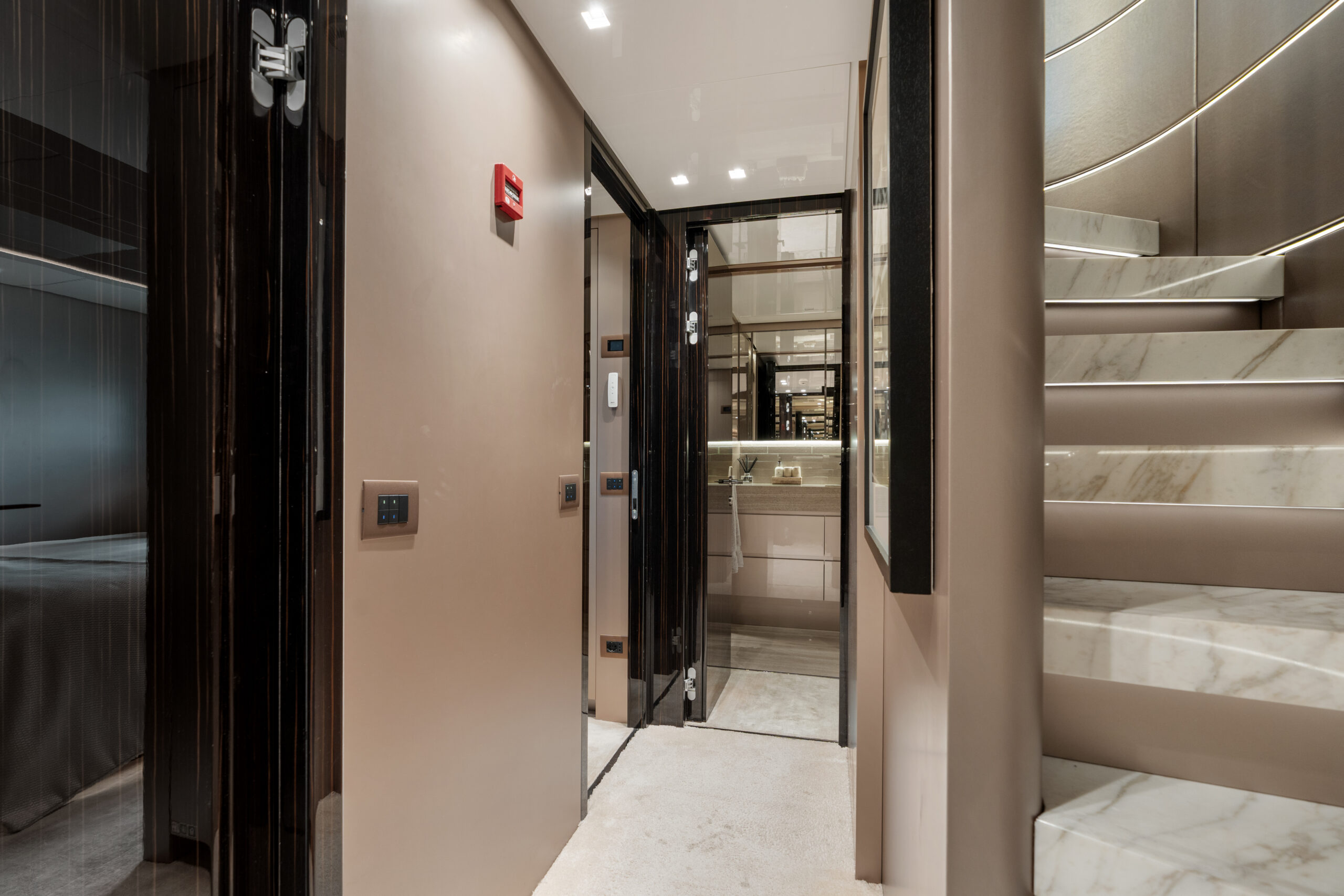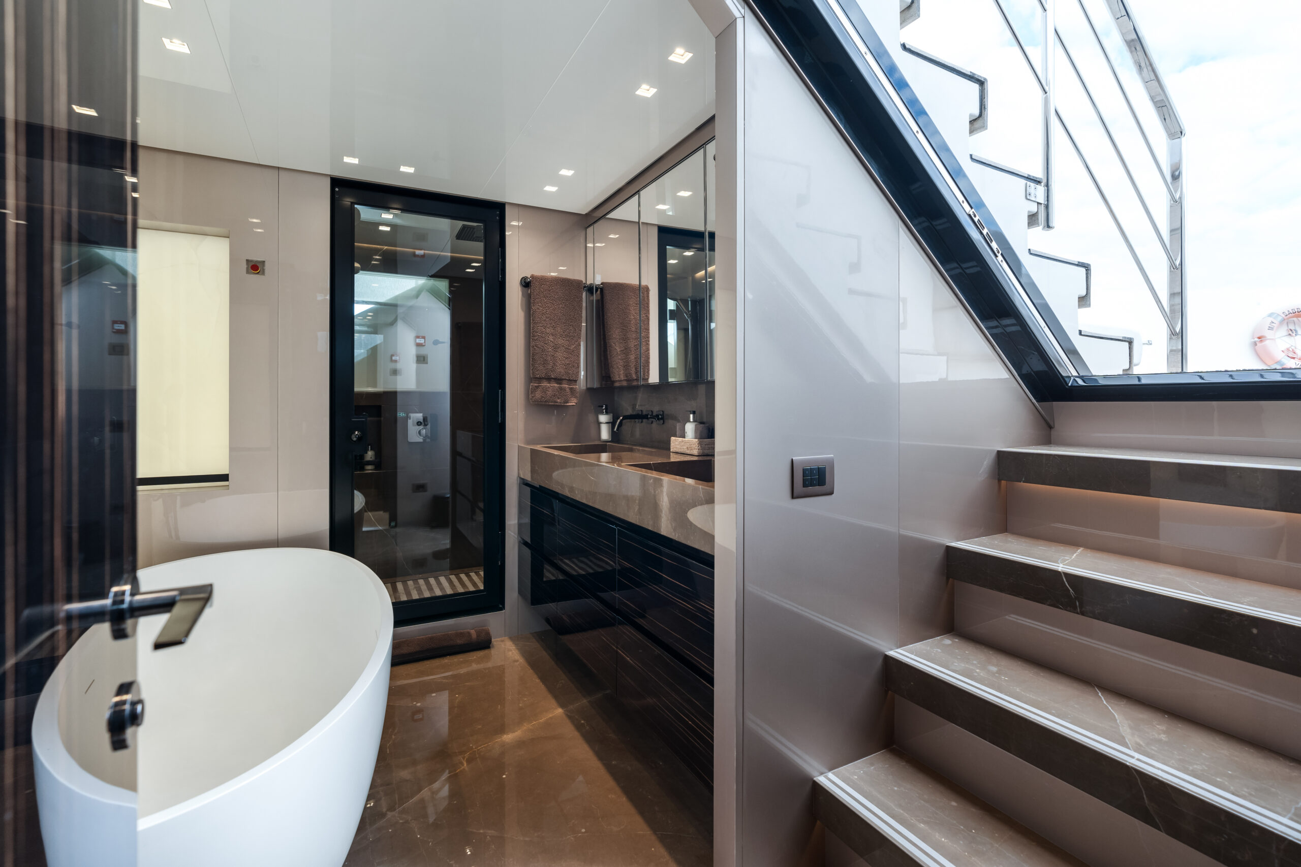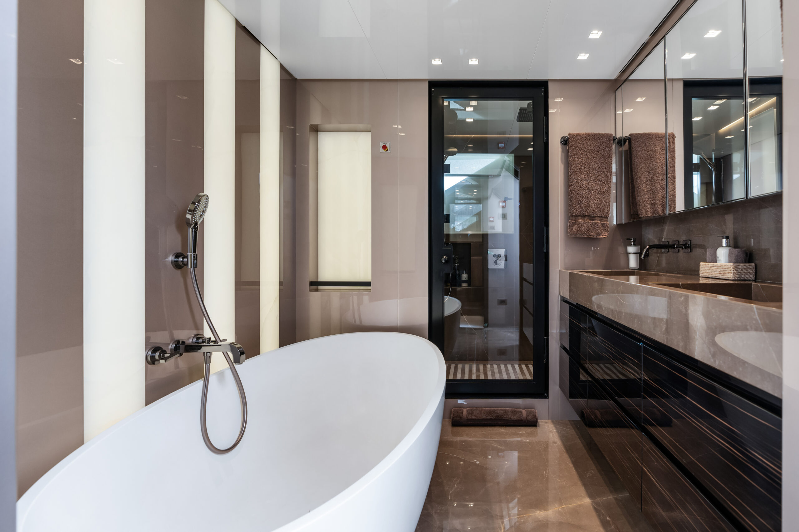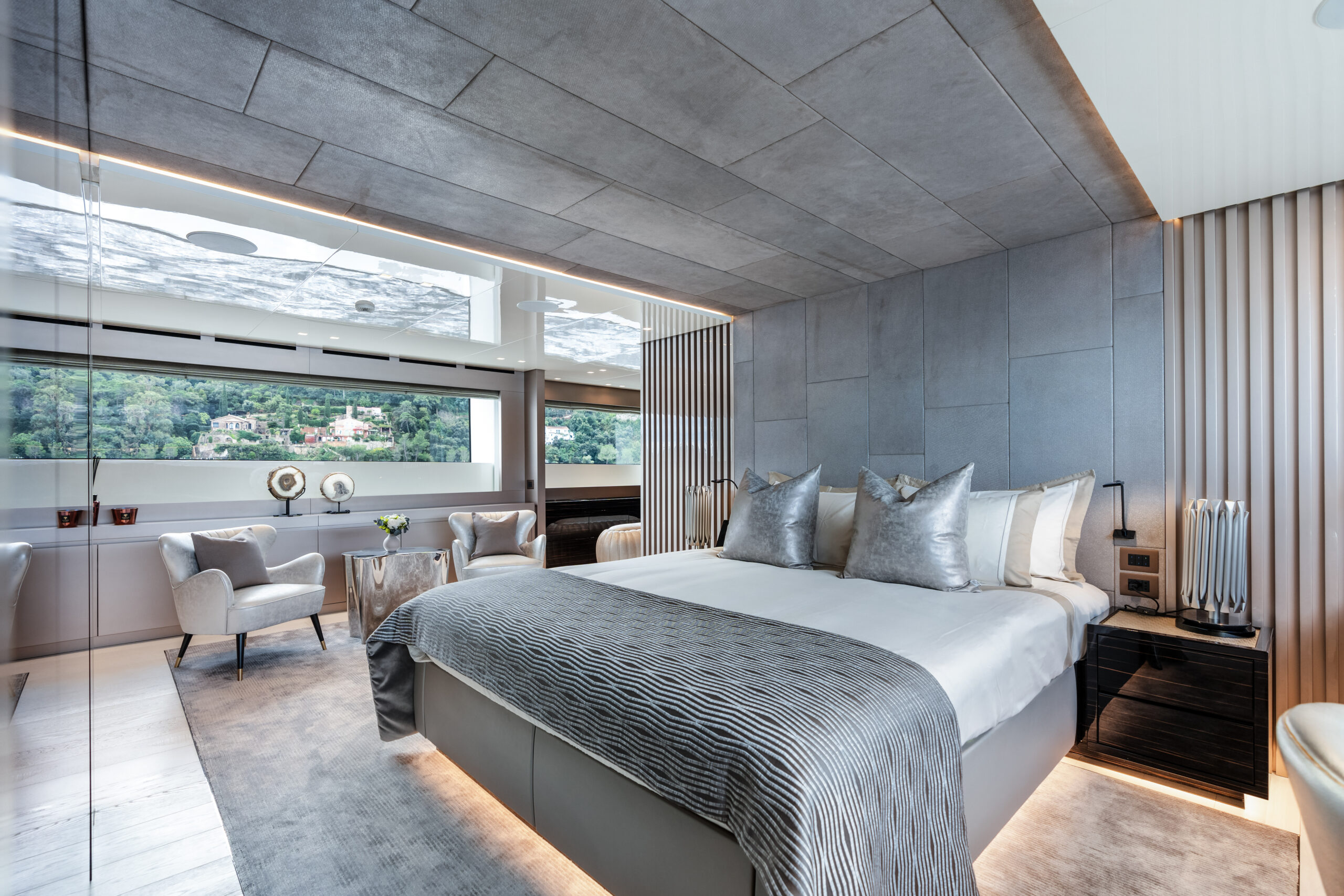 Registered under the Maltese commercial flag, she offers complete flexibility for private cruising or charter operation. Her asymmetric upper deck and wide-body layout create an exceptional sense of space and seamless flow between interior and exterior areas. The three-sided beach club with fold-down terraces transforms into a spectacular, water-level living area which is unmatched in her class. The owner’s suite on the main deck features private access to the foredeck lounge, providing an intimate and sheltered retreat.