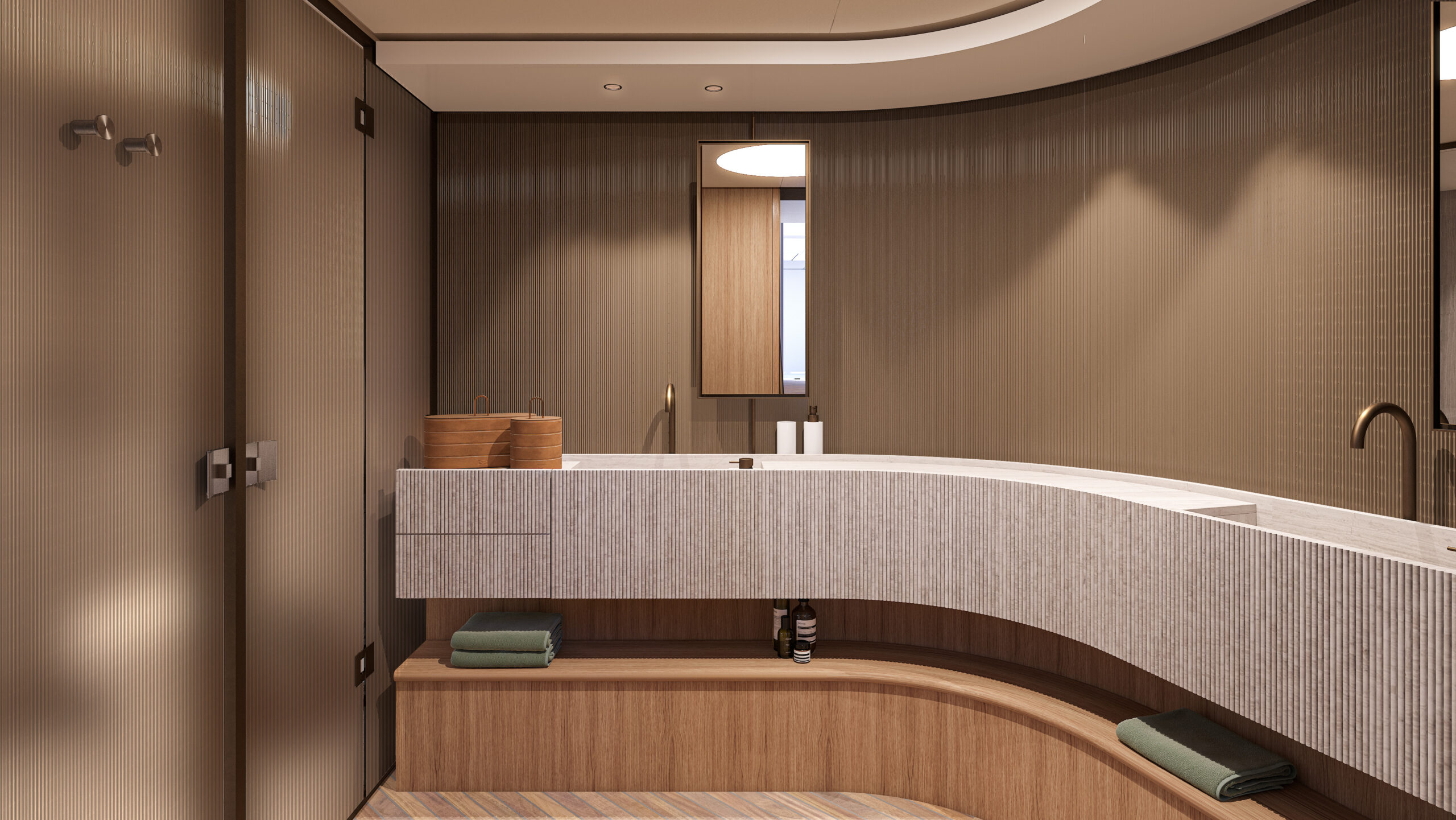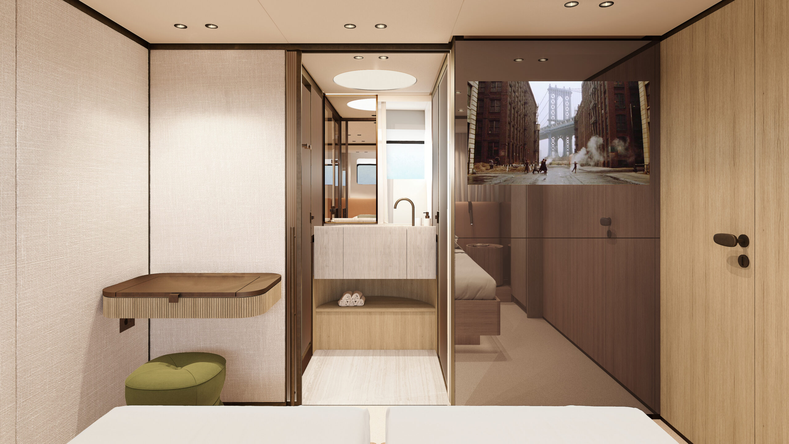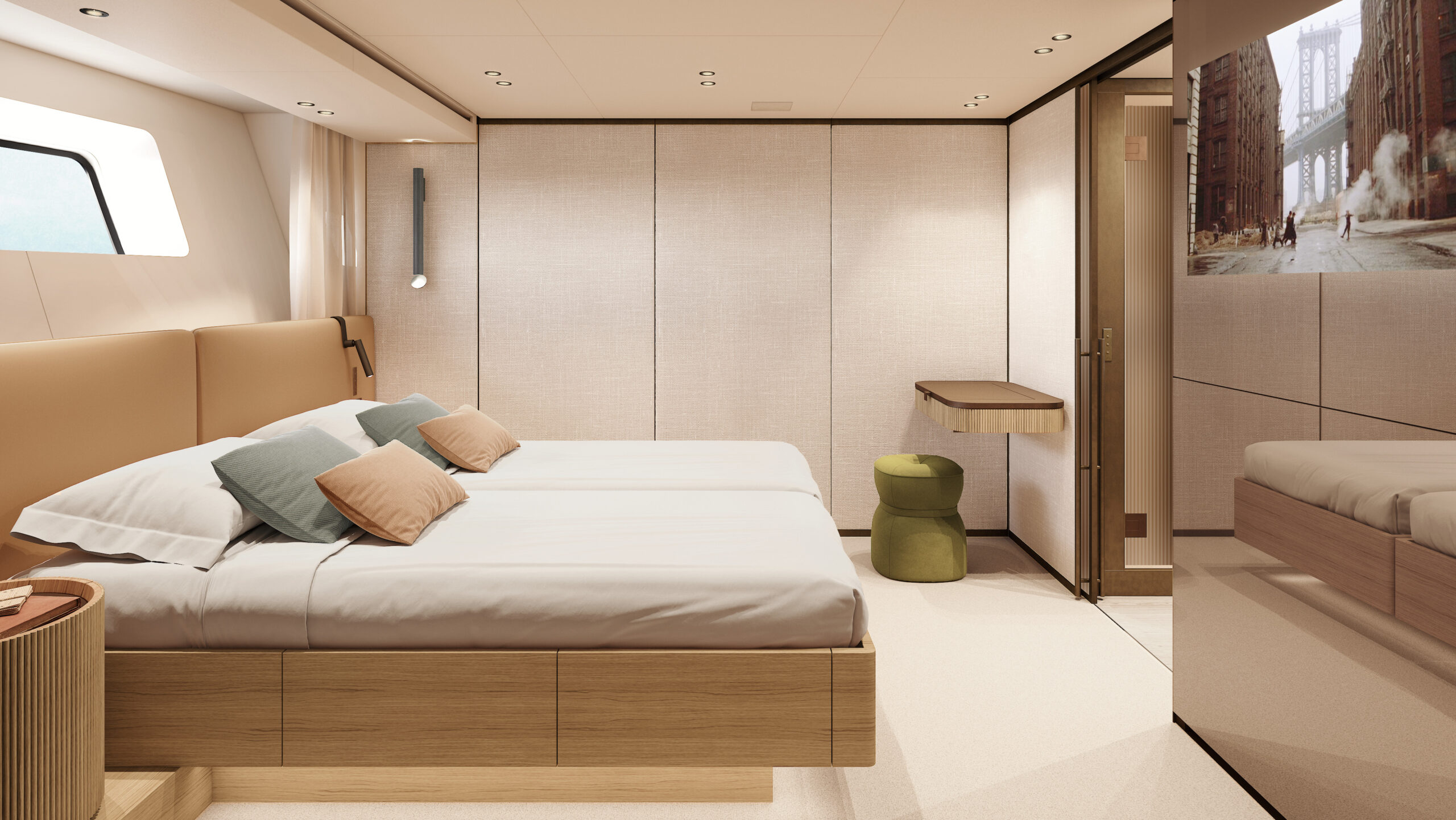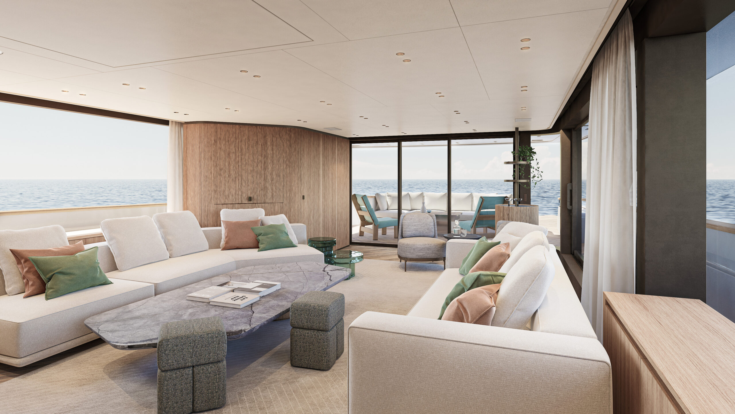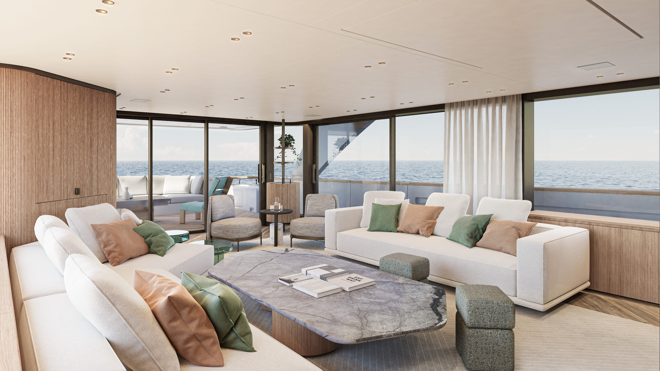 The interiors, designed by Patricia Urquiola, focus on sustainability and transformability, using eco-friendly materials like bio-resins, recycled glass, and Paper Factor wood panelling. Flexible layouts allow areas to shift between lounge and private spaces, while large windows and seamless indoor-outdoor flooring amplify natural light and openness.