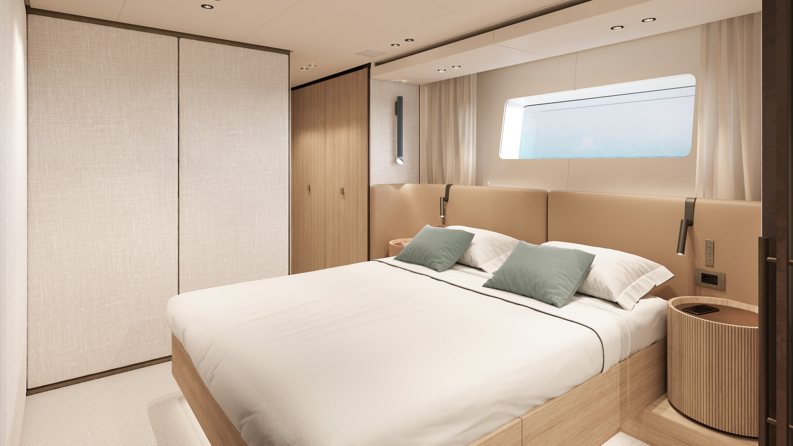 The exterior, by Zuccon International Project, balances elegant lines with generous volumes across two and a half decks, featuring an open flybridge and innovative layouts that enhance onboard livability. The bow area offers two versatile configurations, either for sunbathing or socializing, emphasizing a strong connection to the sea.
